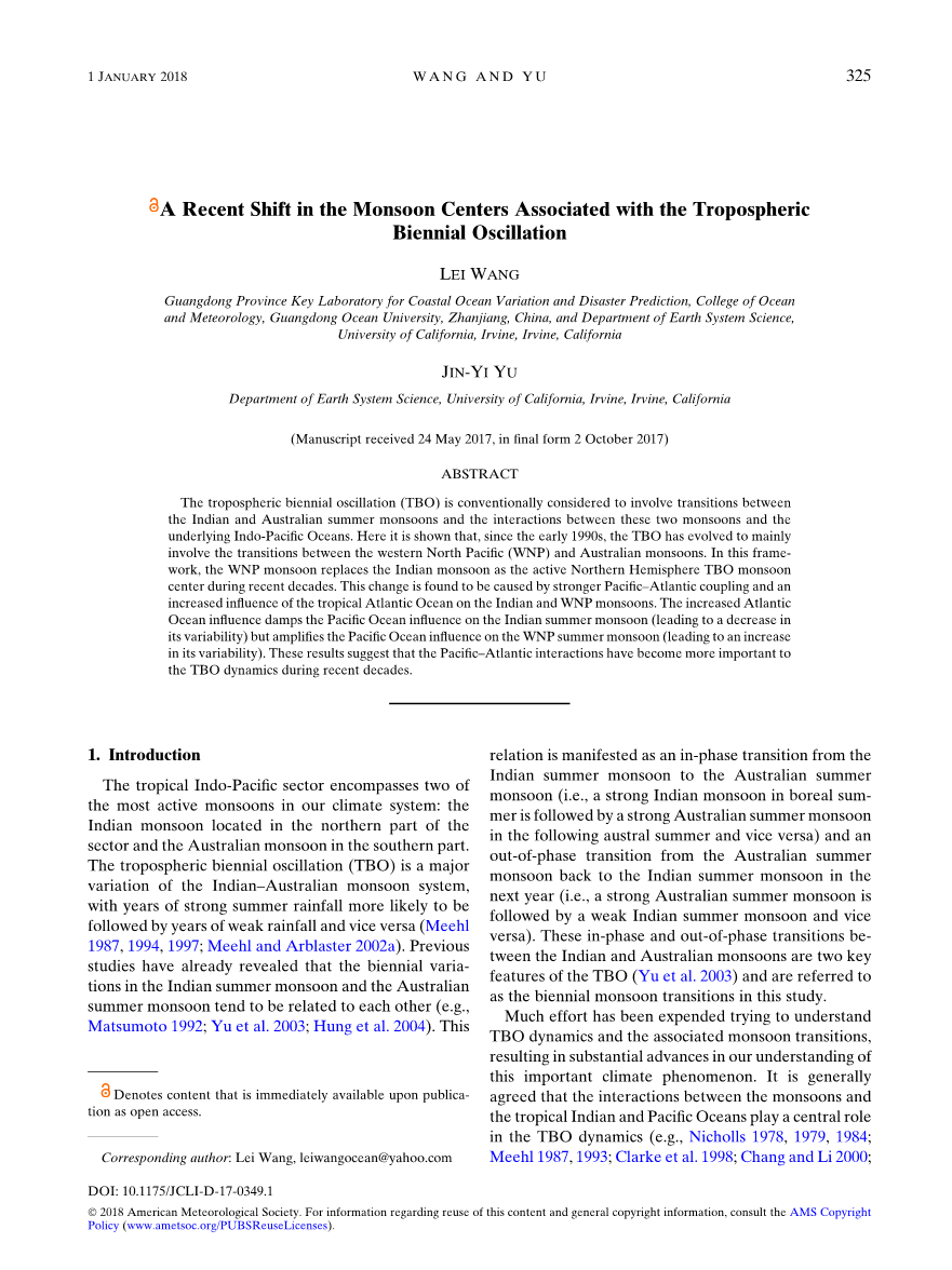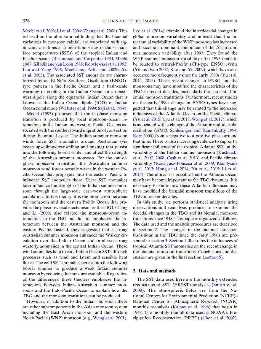 然而,除印度季风外,亚洲季风系统还有包括东亚季风和西北太平洋(WNP)季风(如Wang et al.2001)的其他亚组成部分,。 Lee等人(2014)研究了全球季风变化的年代际变化,并注意到WNP季风的年际变化增加并在1993年以后成为亚洲夏季风变化的主要组成部分。他们发现1993年以后WNP夏季风变率趋于与中太平洋(CP)型ENSO事件(Yu and Kao 2007; Kao and Yu 2009)相关,并且自20世纪90年代初以来出现频率更高(Yu et al。2012,2015)。 ENSO和季风最近的这些变化可能会改变近几十年来TBO的特征,特别是相关的两年季风转变。此外,最近关于1990年代早期变化的ENSO类型的研究表明,这种变化可能与大西洋对太平洋气候的影响增加有关(Yu et al。2015; Lyu et al。2017; Wang et al。 2017),这与那段时间内大西洋多年代振荡(AMO; Schlesinger和Ramankutty,1994; Kerr,2000)在从负值到正值的变化相关。越来越多的证据支持热带大西洋海温对印度夏季风变化和太平洋气候变率的显着影响(Kucharski等,2007; 2008; Cash等,2013)(Rodriacute;guez-Fonseca et al。2009 ; Keenlyside等2013; Hong等2014; Yu等2015; Li等2016)。因此,大西洋可能对TBO的动态变得重要起来。有必要了解在近几十年来这些大西洋的影响可能如何改变TBO的两年一次的季风转变。