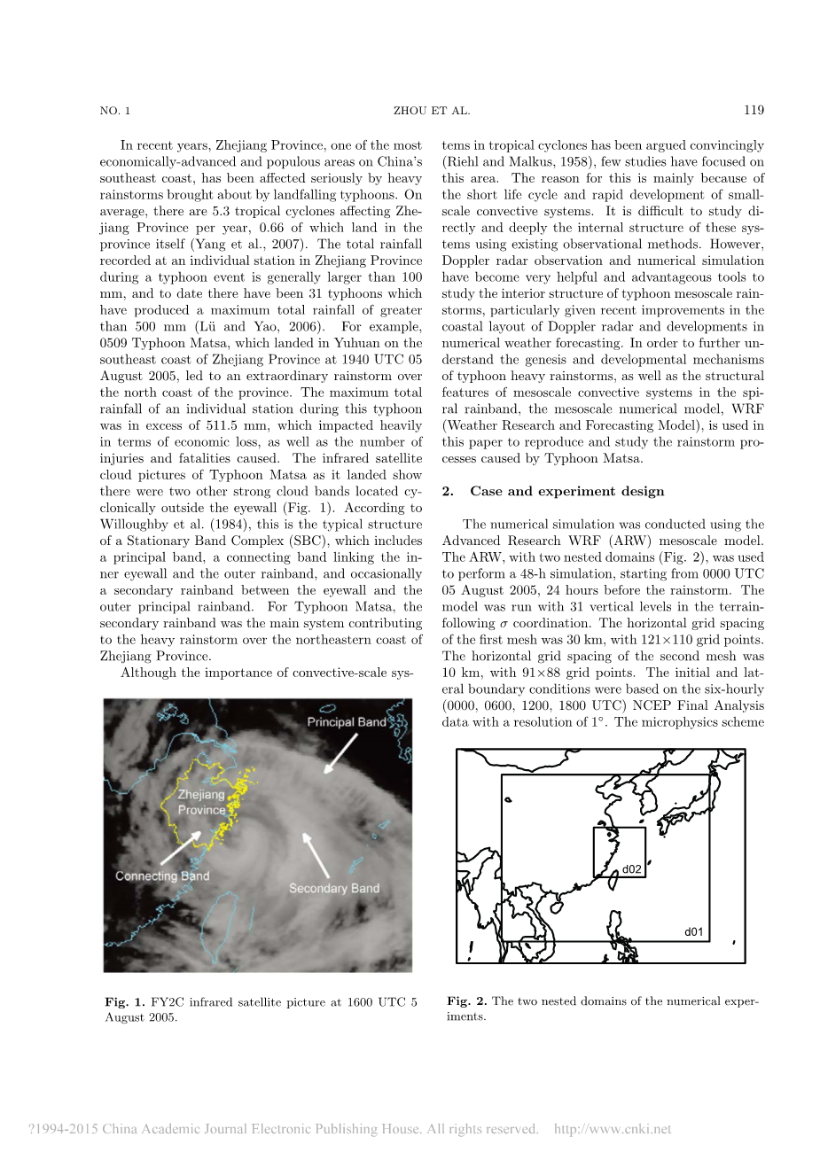 浙江省地处我国东南沿海,经济发达,人口稠密,近几年受台风灾害的影响程度居全国前列。平均每年有5.3个热带气旋影响浙江省,0.66个热带气旋在浙江登陆(Yang等,2007)。根据对所有的台风降水记录资料分析,台风带来的最大单站降水基本都在100mm以上,其中有31次台风带来最大单站降水在500mm以上(Lv和Yao,2006)。例如,0509号台风麦莎于2005年8月5日19时30分在浙江省的东南沿海玉环县登陆,导致了整个浙江省北部发生特大暴雨。台风期间,最大单站降水量接近511.5mm,导致了严重的经济损失和人员伤亡。台风麦莎登陆时的卫星云图显示有两个发展旺盛的云带存在于台风的眼墙外(fig.1)。通过willoughby等人的研究(1984)表明,这是典型的滞性雨带综合体(SBC),它其中包括一个主雨带,一个连接内部眼墙和外部雨带的连接雨带,有时还会有一个位于眼墙和外部主雨带之间的第二雨带。对于台风麦莎来说,第二雨带是导致浙江北部特大暴雨的主要系统。
