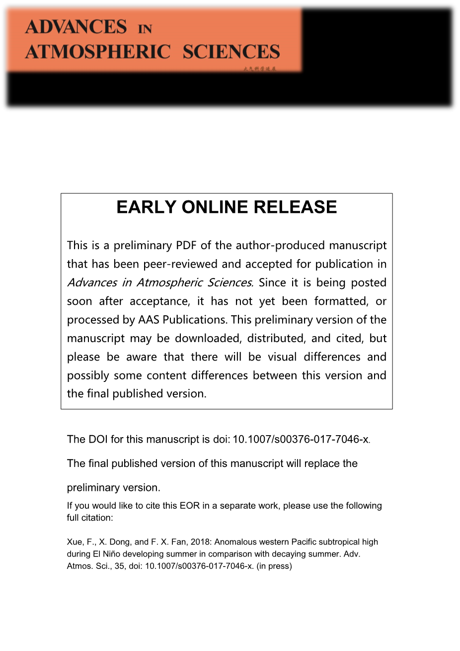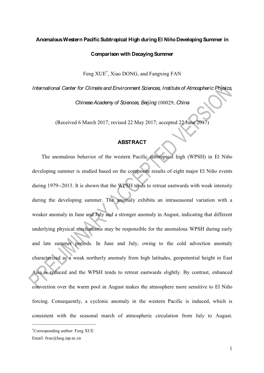 西太平洋副热带高压异常在厄尔尼诺发展的夏季与衰退的夏季的比较外文翻译资料