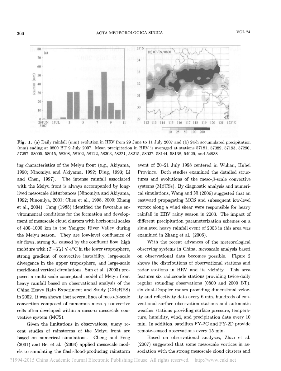 (1)结合来自中国气象局(CMA)大约2400个气象站的资料,并利用从2007年6月29日至7月11日的日降水量记录以及7月8-9日的时降水量记录估测出了HRV降水的时间和空间分布情况。