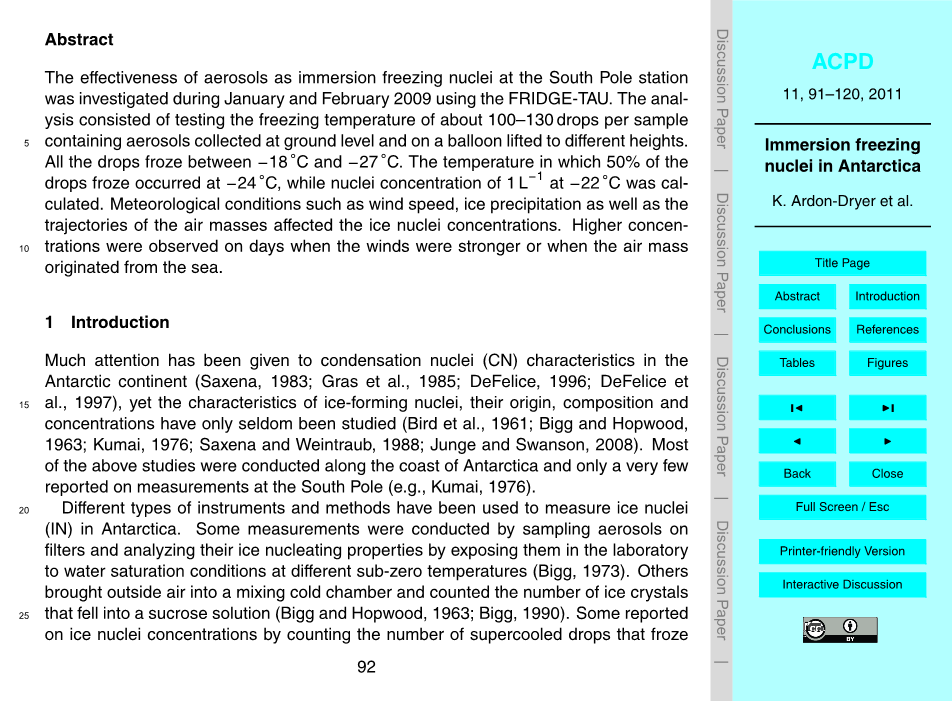 南极站气溶胶作为浸润冻结核的效率在2009年1月和2月被测量了(使用FRIDGE-TAU)。分析包括测量样本的冻结温度,每个样本中含有100-130个液滴,包含从地面以及气球上升至不同高度上采集的气溶胶。所有液滴在至之间冻结。在时计算的核浓度为,其中50%微粒冻结的温度发生在。气象条件如风速,冰相降水以及气团轨迹也会影响冰核浓度。在风速较强或者气团来源于海上的天数观测到的浓度也较高。