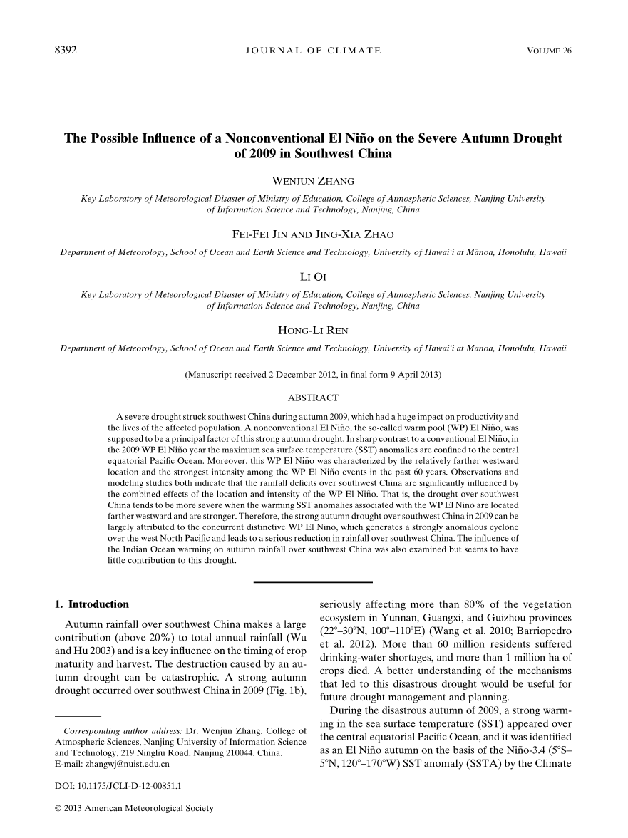 2009年非常规厄尔尼诺对2009年西南地区严重秋旱的可能影响外文翻译资料