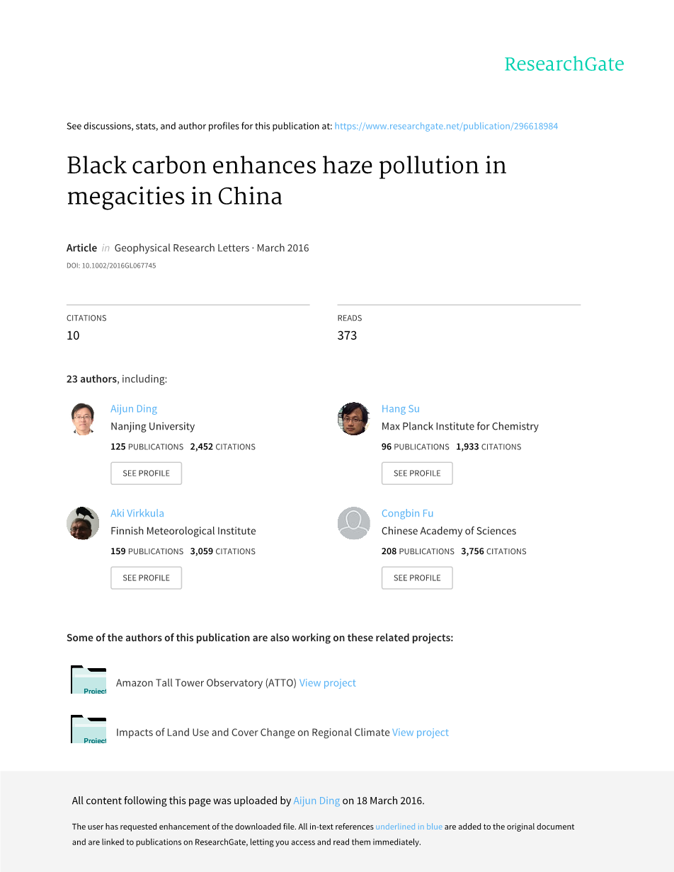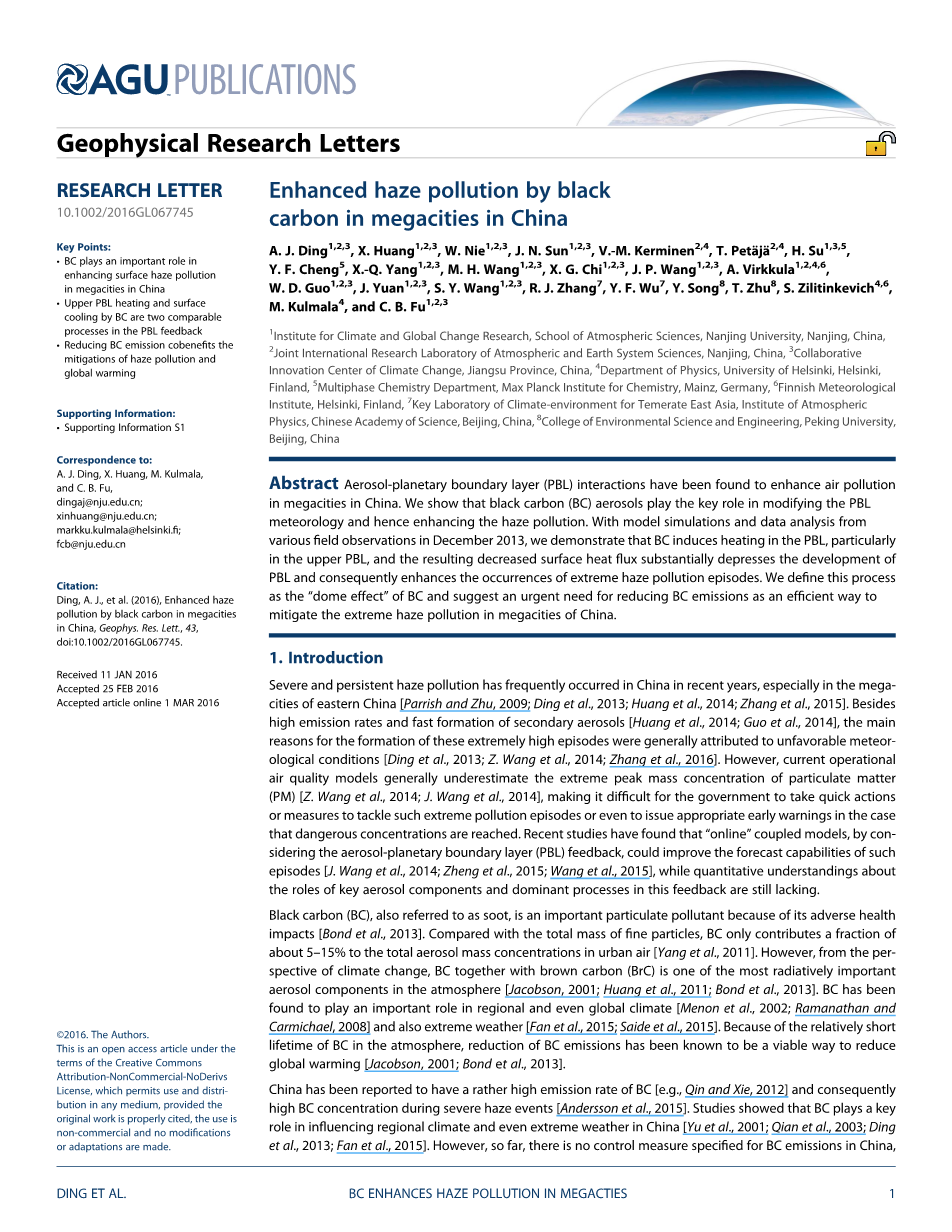 A. J. Ding1,2,3 , X. Huang1,2,3 , W. Nie1,2,3, J. N. Sun1,2,3,V.-M. Kerminen2,4 ,T. Petauml;jauml;2,4 , H. Su1,3,5 ,Y. F. Cheng5, X.-Q. Yang1,2,3, M. H. Wang1,2,3 ,X. G. Chi1,2,3, J. P. Wang1,2,3, A. Virkkula1,2,4,6,W. D. Guo1,2,3,