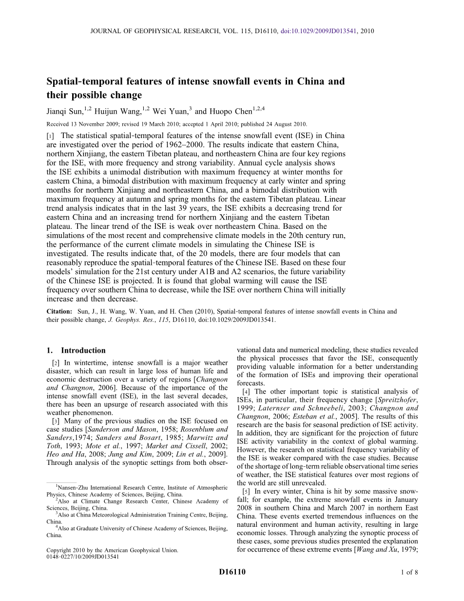 翻译原文:Sun, J., H. Wang, W. Yuan, and H. Chen (2010), Spatial‐temporal features of intense snowfall events in China and their possible change, J. Geophys. Res., 115, D16110, doi:10.1029/2009JD013541.