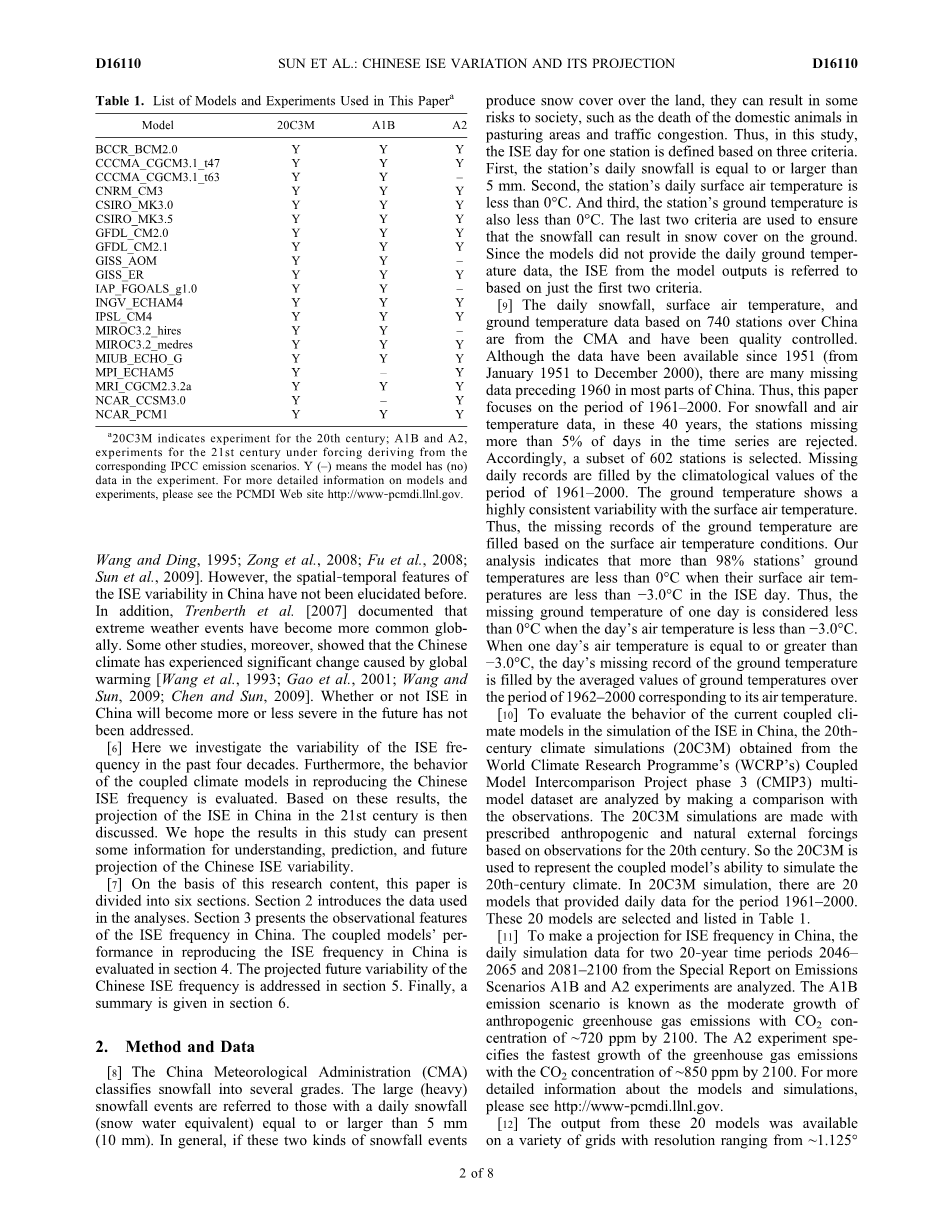 为了探讨当前中国气候耦合模式的模拟,20世纪气候模拟(20C3M)是通过世界气候研究计划(WCRP)和耦合模式比较计划3(CMIP3)与观测结果的而比较,分析出的多模型数据集。20C3M模拟以根据20世纪的观察资料为根据规定了人为和自然强迫。所以,20C3M有能力模拟20世纪耦合模式。在20C3M模式中,有20个数据模型来提供1961年至2000年的日数据资料。挑选出的20个数据模式在表一中列出。