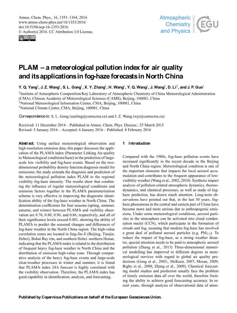 PLAM——空气质量的气象污染指数及其在中国北方的雾霾天气预报中的应用