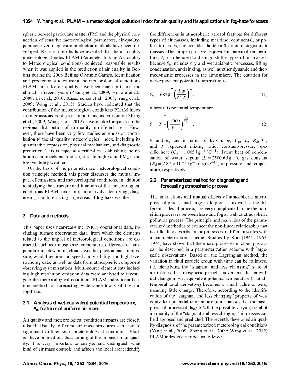 考虑到和大气雾霾预测分析诊断,这是大气气溶胶密切相关(如细颗粒,PM2.5),它是整合的量很重要 PLAM0基础参数与排放的贡献。为了整合与大气压力、温度、湿度、冷凝等相关的初始气象条件随着污染物排放因子,贡献的P,在大气中,识别参数表示由方程(7)(Wang et al., 2012):