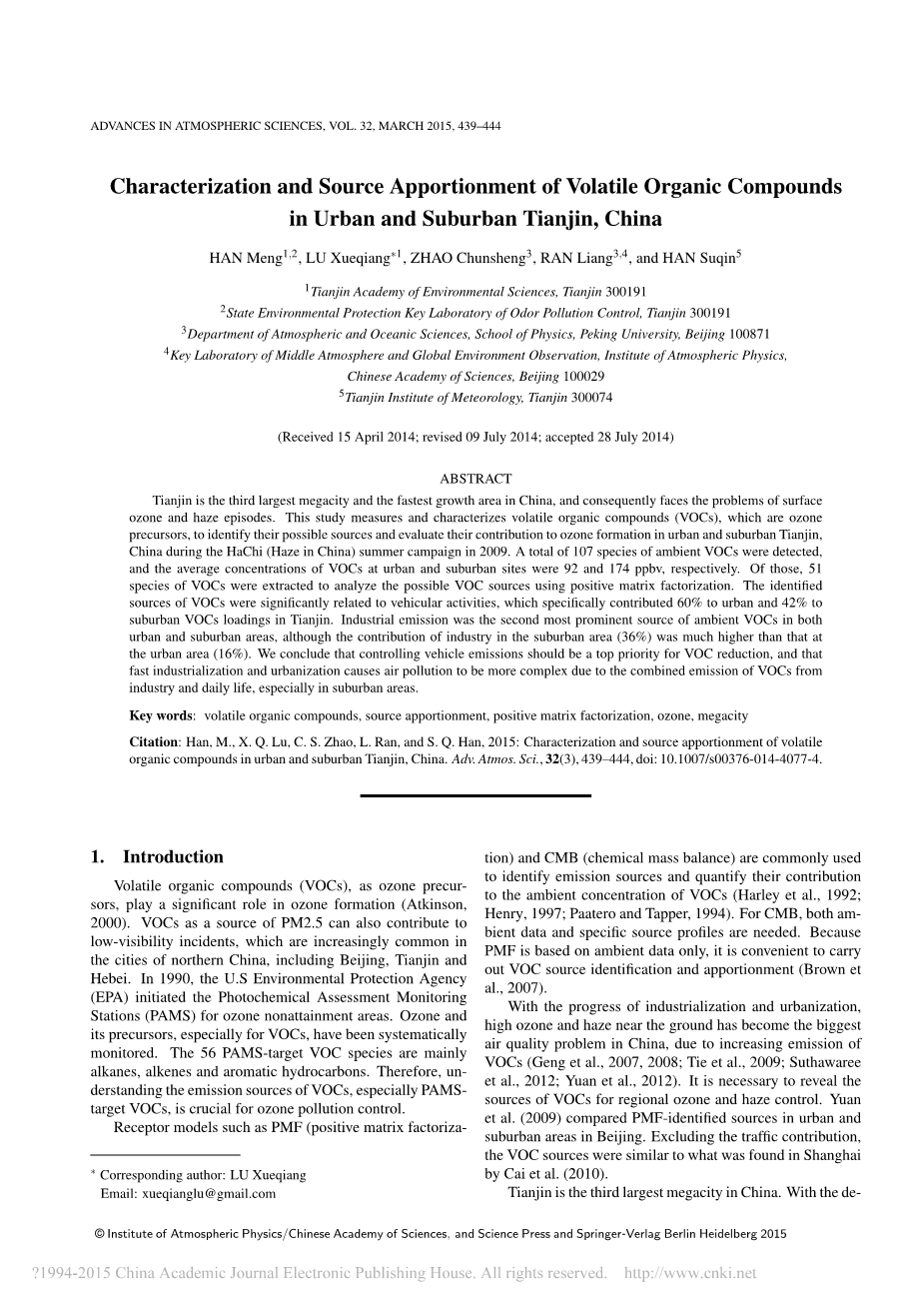 Citation: Han, M., X. Q. Lu, C. S. Zhao, L. Ran, and S. Q. Han, 2015: Characterization and source apportionment of volatile organic compounds in urban and suburban Tianjin, China. Adv. Atmos. Sci., 32(3), 439–444, doi: 10.1007/s00376-014-4077-4.
