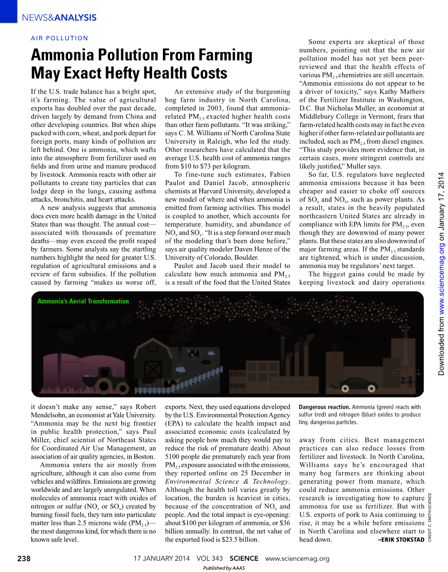 2003年完成的北卡罗来纳州蓬勃发展的猪场养殖业的广泛研究发现,与其他农业污染物相比,氨化PM2.5的健康成本更高。领导这项研究的是罗利的北卡罗来纳州立大学的C.M。Williams博士说:“这很引人注目。 其他研究人员也已经计算出,美国平均每公斤氨氮健康成本从10美元到73美元不等。为了调整这些估计,哈佛大学大气化学家Fabien Paulot和Daniel Jacob开发了一种新的农业活动中氨排放的模式。这个模型是耦合到另一个,代表温度、湿度和NOx和SOx的丰富度。科罗拉多大学的空气质量建模师Daven Henze说,这是以前完成的大部分建模的一步。