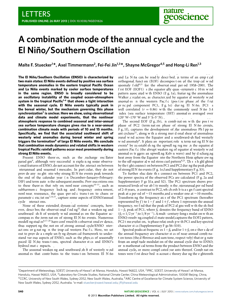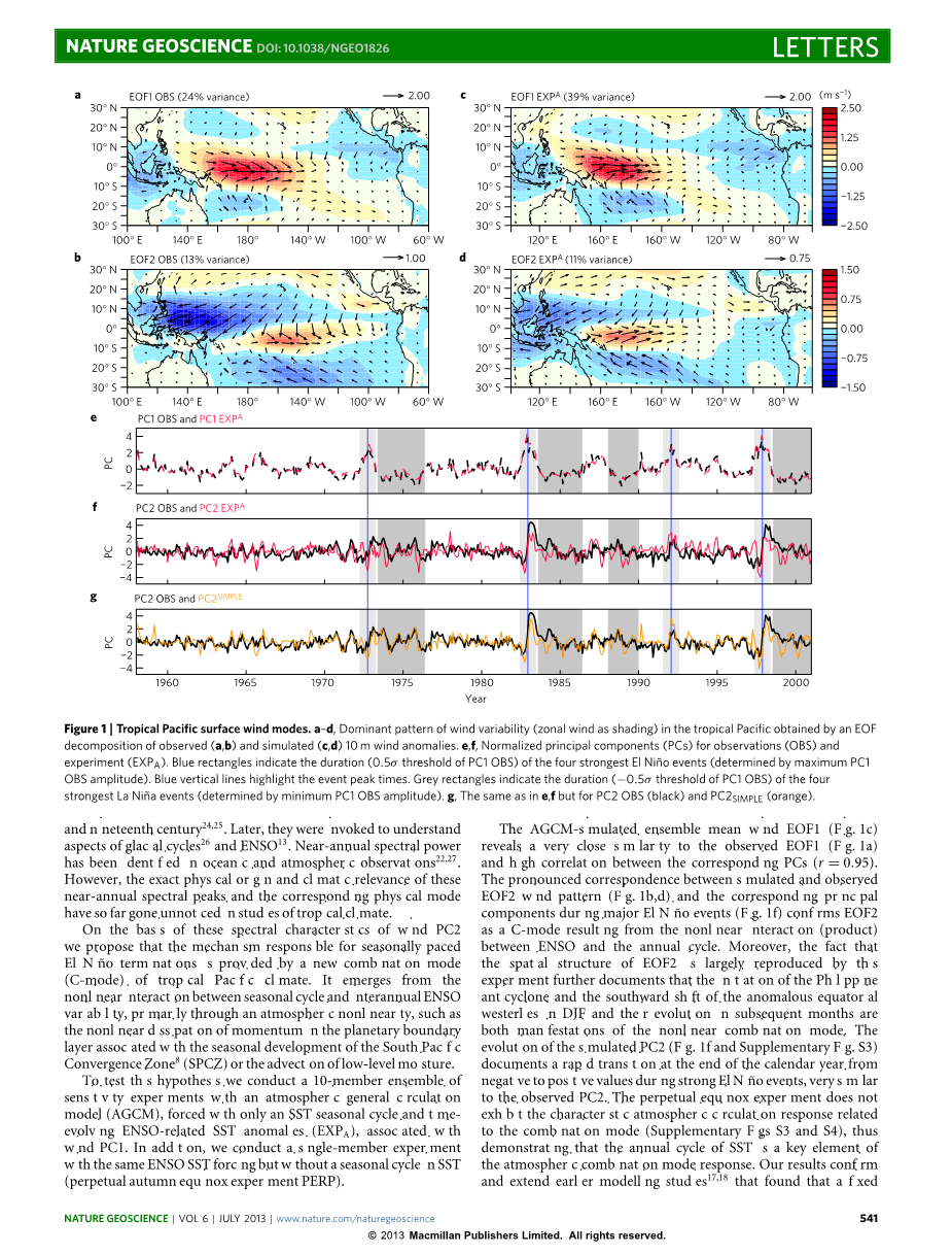 在风PC2序列的这些光谱特征的基础上,我们提出导致厄尔尼诺季节性调整终止的机制由热带太平洋气候的新的组合模式(C模式)提供。它源于季节循环和年际ENSO变率之间的非线性相互作用,主要通过大气非线性,例如与南太平洋辐合区(SPCZ)的季节性发展或者底层湿度平流相关的行星边界层中动量的频散。