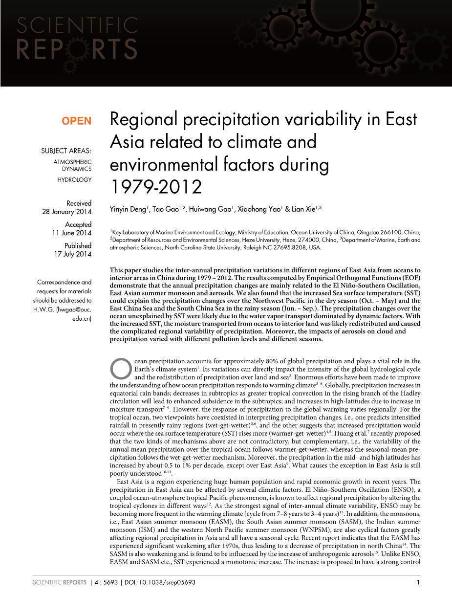 1979- 2012年间东亚地区与气候和环境因素相关的降水变率外文翻译资料