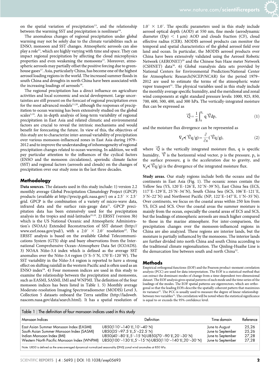 数据来源: 本研究中使用的数据集包括:1)2.5u 2.5u的网格版本2.2月平均全球降水气候学项目(GPCP)产品(http://precip.gsfc.nasa.gov/)。GPCP是各种微波数据,红外数据和表面雨量计数据的组合21。 GPCP降水资料已广泛用于热带和中纬度地区的降水分析21,22。 2)ERSST(版本3b),它是美国国家海洋和大气管理局(NOAA)扩展重建SST数据集(http:// www.esrl.noaa.gov/psd/),具有2.0u 3 2.0u的分辨率23。ERSST分析基于国际综合海洋 - 大气数据集(ICOADS)的现有全球电信系统(GTS)船舶和浮标观测资料。 3)NOAA Nin -o-3.4指数,定义为Nin〜3.4区域(5uS-5uN,170uE-120uW)的平均SST异常值。 据报道,Nin -o-3.4地区的SST变率对西太平洋降水的变化有很大的影响,常被用作ENSO指数24。 4)本研究中采用四季风,来分析降水和季风之间的关系,如EASMI,SASMI,IMI和WNPMI。四种季风的定义见表(1. 5)月平均中等分辨率成像光谱仪(MODIS)3级,Terra卫星上的五组数据集.(http:// ladsweb。nascom.nasa.gov/data/search.html)。它的空间分辨率为1.0 ͦtimes; 1.0 ͦ。本研究中使用的具体参数包括550nm处的气溶胶光学深度(AOD),精细模式(空气动力学直径(Dp),1mm)AOD和云分数(CF),云有效半径(CER)。 MODIS气溶胶产品可以监测全球气溶胶场在陆地和海洋上的时空特征。特别是使用气溶胶机器人网络(AERONET)29和中国太阳雾仪网络(CSHNET)数据30对中国MODIS气溶胶产品进行了广泛的验证。 6)国家环境预测中心/国家大气研究中心(NCEP / NCAR)在1979 - 2012年期间提供的全球再分析数据用于估算大气水汽输送的条件31。本研究中使用的物理变量包括月平均比湿度以及八个标准压力水平下的经向和纬向风分量:1000,925,850,700,600,500,400和300hPa。垂直的集合水汽通量可以表示为