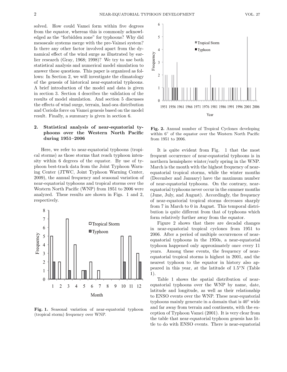 近赤道热带气旋仅只占热带气旋的很小一部分,甚至只有更少的热带气旋会在低纬度地区进一步发展为台风。但是,这些热带气旋仍然是重要的,而且它们的模拟也是非常具有挑战性的,因为它们定义了极端条件下热带气旋形成的动力学原因。以前,有一些关于近赤道台风的调查。Forther(1958)是第一个使用航空气象侦查数据来总结近赤道台风“Sarah”的性质特征的人。基于一些统计研究,Holliday 和 Thompson (1986)总结出了赤道以北5° 的二次定向风切变带可能与近赤道台风的成因有关。特别是关于台风“Vamei”,已经有一些研究探讨了这一罕见事件的发生。Chang等人(2003)指出,2001年12月强而持久的寒潮,为背景气旋涡度提供了起源,而且也是“Vamei”发生的至关重要的原因。他们的结论表明,弱婆罗洲涡和持续的东别寒潮的相互作用导致了近赤道台风的形成。他们进一步指出,南海地区的地形和海路分布可能也是一个重要因素。Juneny等人(2007)在TRMM卫星观测的基础上推测,较高的海面温度是台风“Vamei”激烈化的一个潜在原因。Chambers和Li(2007)用一个MM5模型模拟研究了“Vamei”成因的物理机制。PV(位涡)和涡量方程的分析表明,与台风系统快速强化的过程与中尺度涡旋的合并有很大关系。他们的结论是,台风“Vamei”的形成是由于大规模的环境背景场和中尺度系统之间的相互作用。