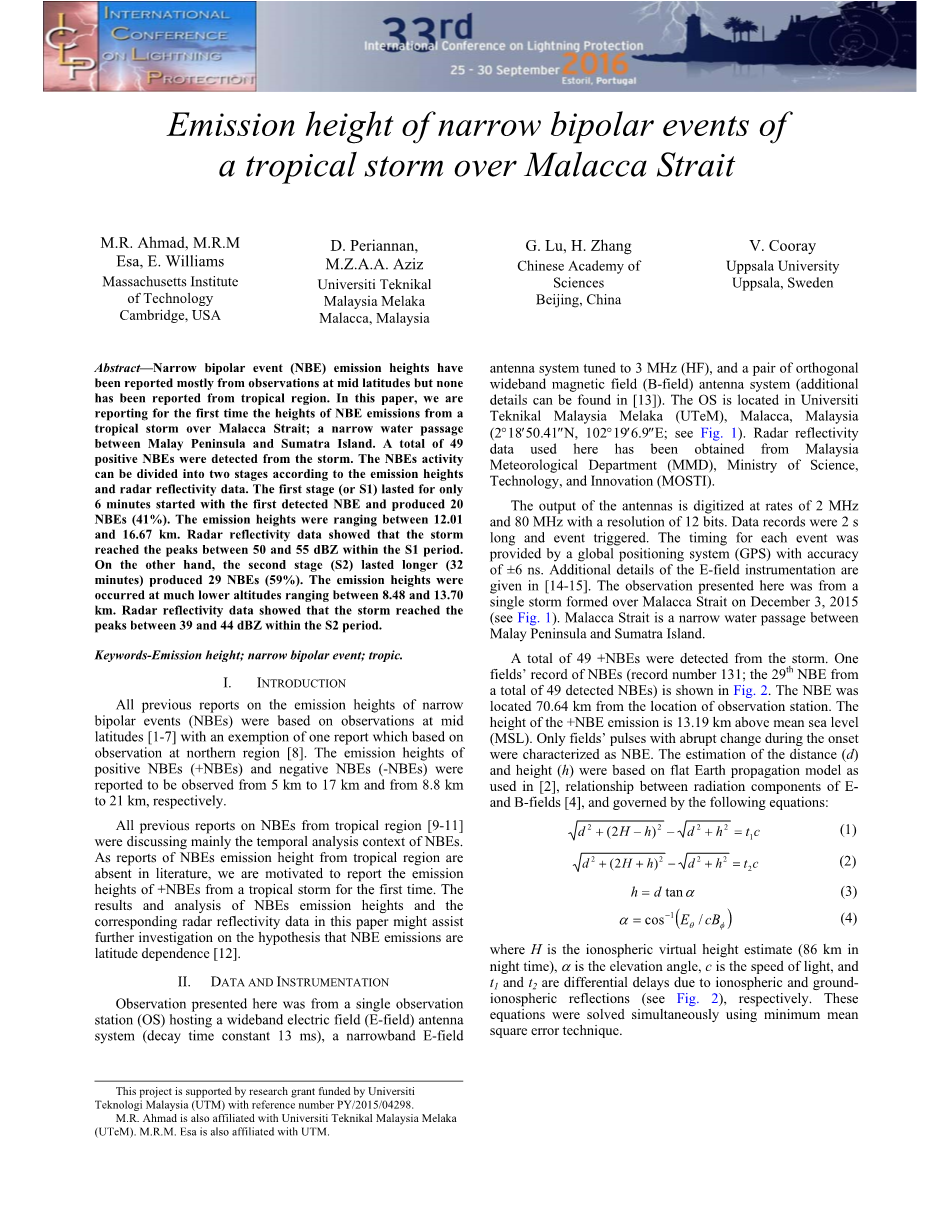 马六甲海峡上空一次热带风暴中的双极性窄脉冲事件发生高度外文翻译资料