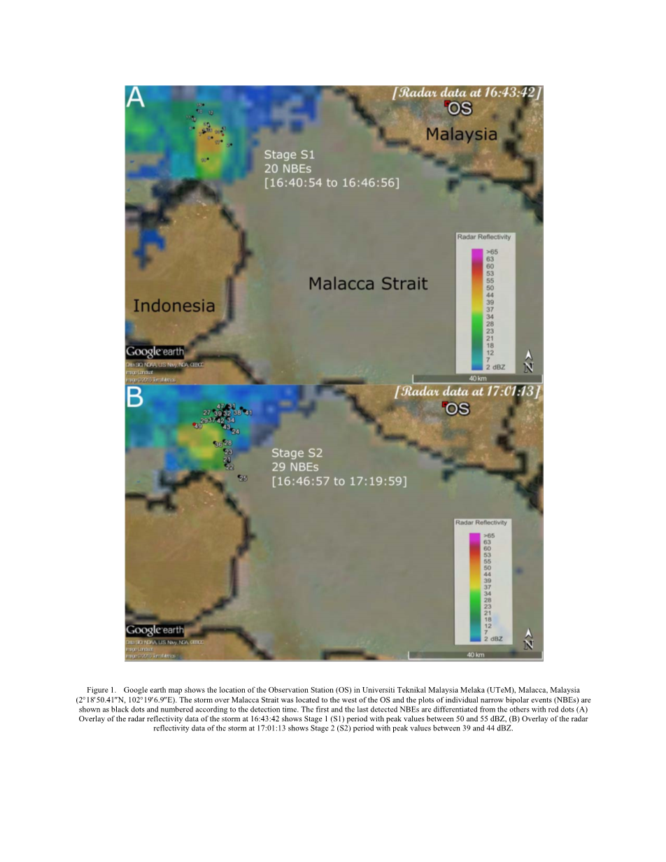 天线的输出以12比特的分辨率配合2MHz和80MHz的采样率数字化。数据记录从事件开始持续2s时长。每个个例的时间记录系统是精确度为plusmn;6ns的全球定位系统(GPS)。本文观测为2015年12月03日在马六甲海峡形成的雷暴单体。马六甲海峡是在马来半岛和苏门答腊岛之间有一条狭窄的水路。