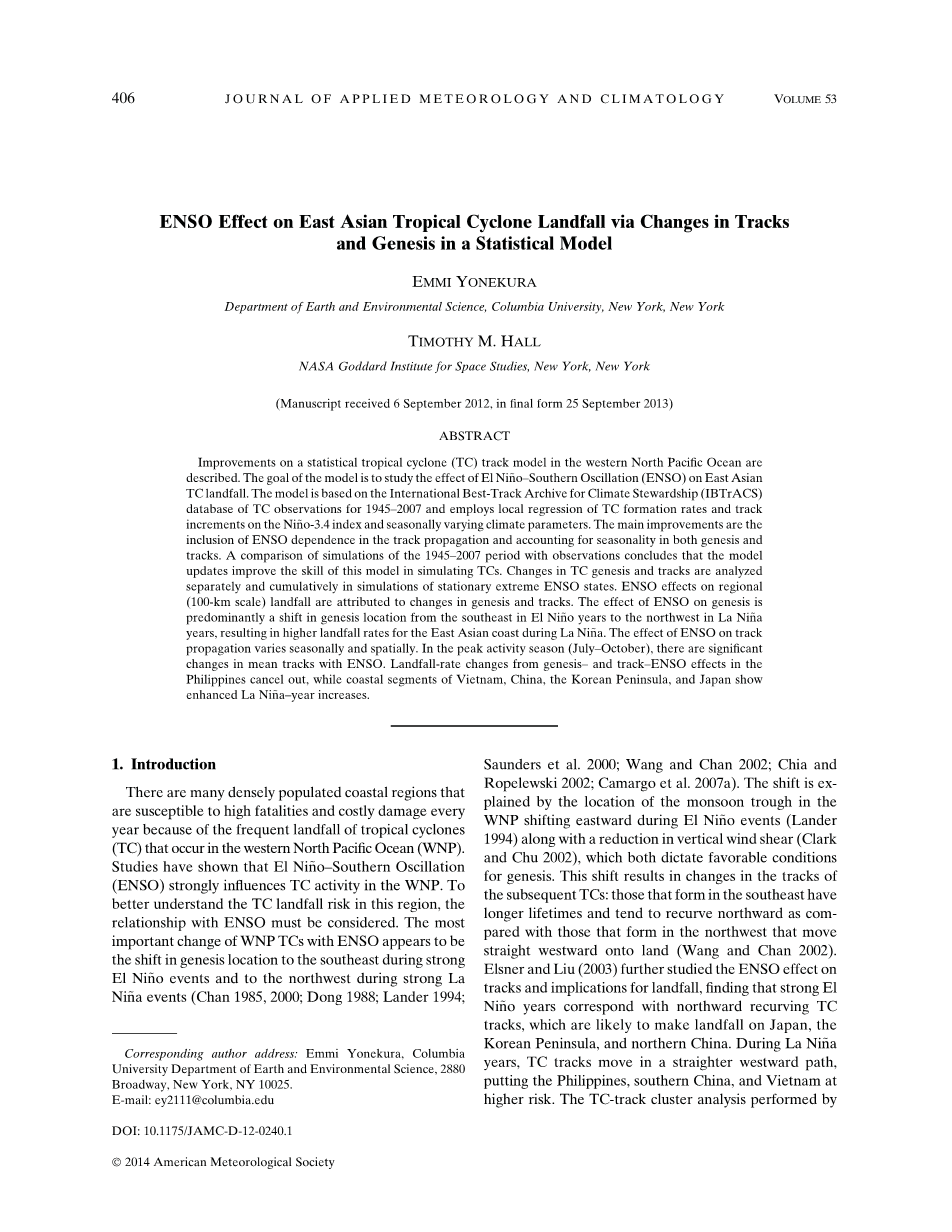 通过路径及发源地变化的统计模型研究ENSO对东亚热带气旋登陆影响外文翻译资料