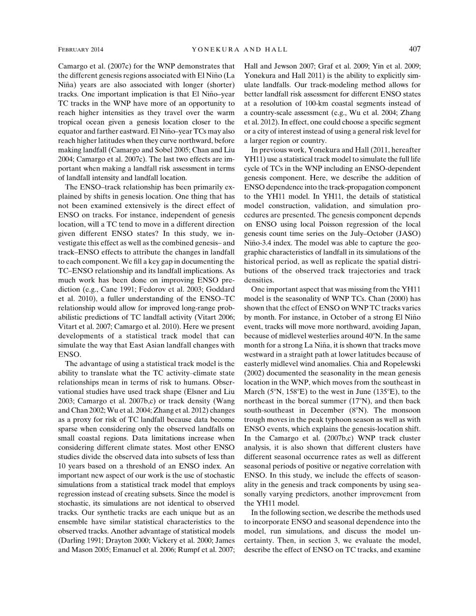 大多数其他ENSO的研究将观测数据划分成基于一种ENSO指数的阈值不到10年的子集。我们工作的一个重要的新的方面是,它采用随机模拟的回归的统计路径模型,而不是创建子集。由于模型是随机的,它的模拟观察到的路径是不相同的。我们合成的每一个路径是独立的,但作为一个集合对观察到的路径有类似的统计特征。统计模型的另一个好处(Darling 1991年; Drayton 2000年; Vickery等人. 2000年; James 和Mason 2005年; Emanuel 等人. 2006年; Rumpf等人. 2007年; Hall 和 Jewson 2007年; Graf等人 2009年; Yin 等人. 2009年; Yonekura 和 Hall 2011年)是有明确地模拟登陆的能力。我们路径建模方法允许评估不同的ENSO状态登陆的几率并且具有100公里的海岸段的分辨率,而不是一个国家规模(例如,吴等2004年; 张等2012年)。实际上,人们可以根据喜好选择一个特定的段或一个城市,而不是使用一个更大的地区或国家总体风险水平。