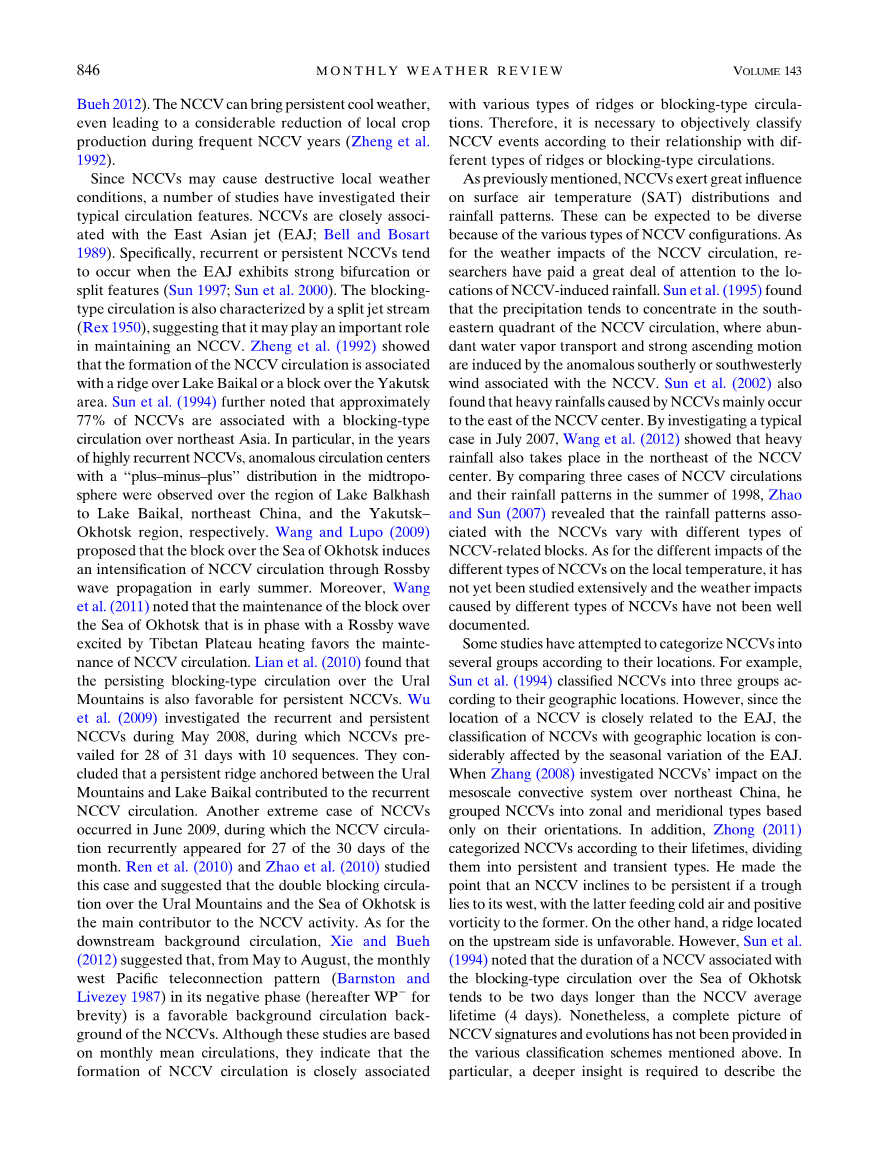 东北冷涡可能会造成极端天气现象,已经有很多关于其环流特征的研究。东北冷涡与东亚急流密切相关(EAJ; Bell and Bosart1989).具体来说,持续性的东北冷涡倾向于发生在东亚急流强烈分裂的时期。阻塞环流的特征是分裂急流(Rex 1950),他认为它可能在维持东北冷涡方面有重要作用。Zheng et al. (1992)认为东北冷涡的形成与贝加尔湖的脊和雅库茨克的脊有关系,Sun et al. (1994)进一步指出,77%的东北冷涡与东北亚的阻塞性环流有关。特别是,在东北冷涡年,分别通过巴尔喀什湖到贝加尔湖,中国东北和鄂海地区观察发现,在对流层中心有有一个“加–减–加”分布,Wang and Lupo (2009)提出在初夏鄂海的脊通过罗斯贝波使东北冷涡环流得到增强。此外,Wanget al. (2011)注意到鄂海的脊和在青藏高原的罗斯贝波有利于东北冷涡环流的增强。Lian et al. (2010) 发现乌拉尔山的持续阻塞型循环也对东北冷涡的维持有利。Wuet al. (2009)提出鄂霍次克海的阻塞通过初夏罗斯贝波传播引起东北冷涡的加剧。此外, Wang et al. (2011)提出鄂海的维持与罗斯贝波的激发有利于青藏高原加热东北冷涡。Lian et al. (2010)发现乌拉尔山的阻塞环流的维持也有利于东北冷涡的维持。Wuet al. (2009)调查了2008年5月的东北冷涡的持续性,他们得出结论,乌拉尔山和贝加尔湖间的一个持久的脊导致东北冷涡复发。另一个nccvs东北冷涡极端时间发生在2009年6月,这期间东北冷涡循环反复出现27天在一个月内。Ren et al. (2010) and Zhao et al. (2010)研究这个案例,表明在乌拉尔山和鄂霍次克海的双阻塞环流是东北冷涡活跃的主要因素。至于下游环流背景, Xie and Bueh(2012) 认为,从5月到8月,西太平洋月遥相关系数(Barnston and Livezey 1987)处于负位相(以下简称WP2)是一个有利于东北冷涡的背景。虽然这些研究都是基于月平均环流,但是他们表明,东北冷涡环流的形成与不同类型的脊或阻塞型环流密切相关。因此,根据不同类型的脊或阻塞型环流的关系分类东北冷涡事件是很有必要的。