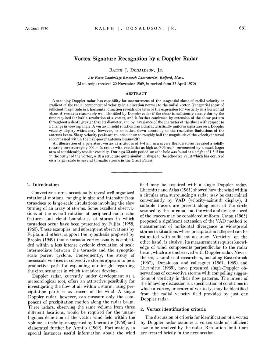 总之,如果i)在准水平平面中存在显着的径向速度切向剪切,并且角度直径和剪切模式的仰角之和,则通过单个多普勒雷达观察可以很好地识别涡旋。 不到半弧度 - 参见下面的方程式(2); 和ii)切向剪切的稳定分量持续至少涡旋一次旋转所需时间的一半[见方程式(3)]。进一步确认涡旋是通过以下方式给出的:iii)剪切图案的垂直延伸直到高于其直径的高度,以及iv)剪切图案的特征的定性不变性,其中视角的变化接近或超过45°。
