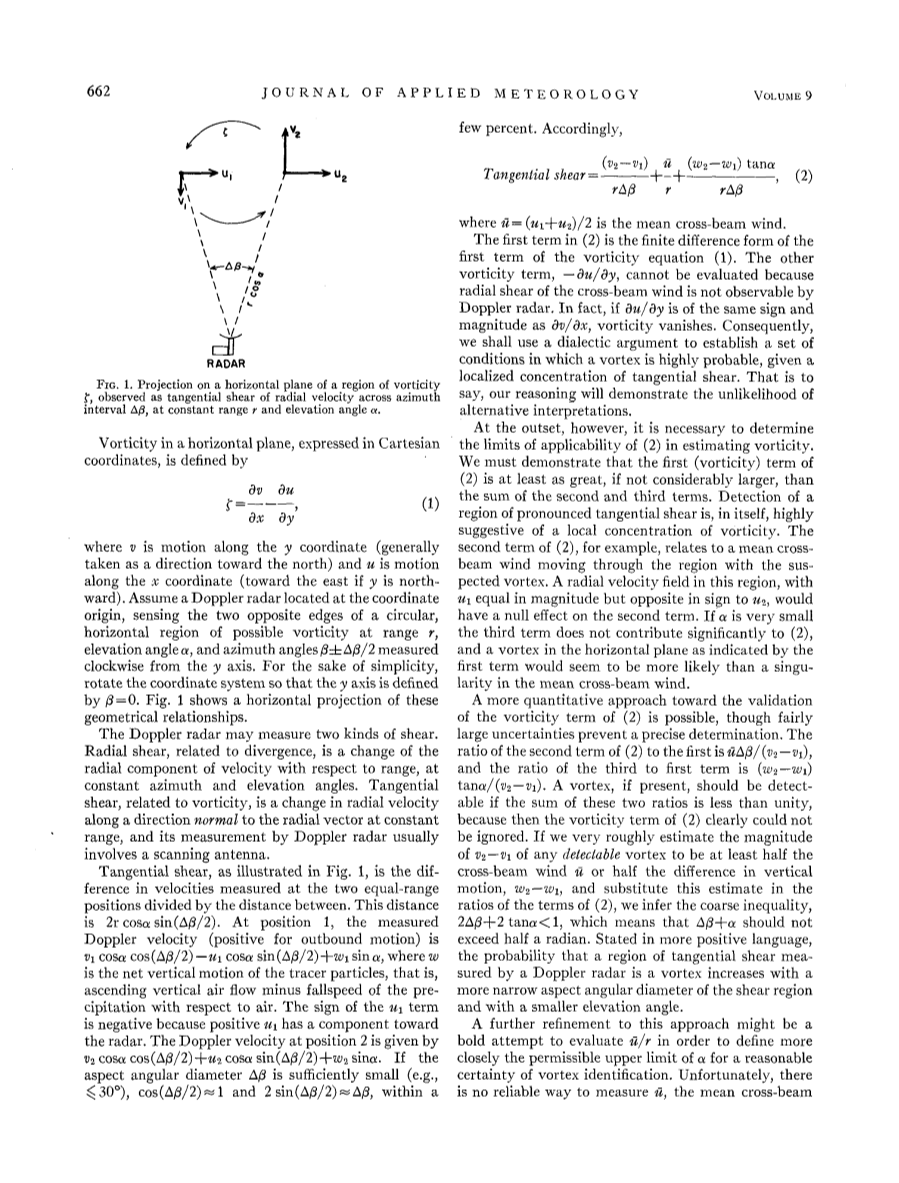 虽然相当大的不确定性妨碍了精确的确定,但是可以采用更加量化的方法来验证(2)的涡度项。(2)第二项至第一项的比值是,第三项与第一项的比值是。涡旋,如果如果这两个比率的总和小于1,则应该是可检测的,因为那时(2)的涡度项显然不能被忽略。如果我们非常粗略地估计任何可检测涡流的V2-V1的大小。至少是横梁风的一半,或垂直运动的差异的一半,,并用(2)项的比率代替这个估计,我们推断出粗不等式,这意味着应该注意半弧度。用更积极的语言表示,多普勒雷达测量的切向剪切区域是涡旋的概率随着剪切区域的较窄的纵向角直径和较小的高度而增加。