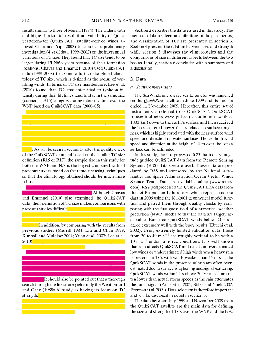 随着 QuikSCAT 海洋表面风的数据的积累(直到2009年其消亡),可以提取出更大的TCs样本。因此,本研究的主要目的是在WNP(包括南海)和NA(包括加勒比海和墨西哥湾)上建立一个更全面的TC大小和TCs强度的气候学。将出现在第三节,质量检查后 QuikSCAT 数据和基于相似的TC大小定义(R15或R17),本研究的样本量WNP和NA是最大的相比之下,所有先前的研究基于遥感技术,这样获得的气候学应该更完善。