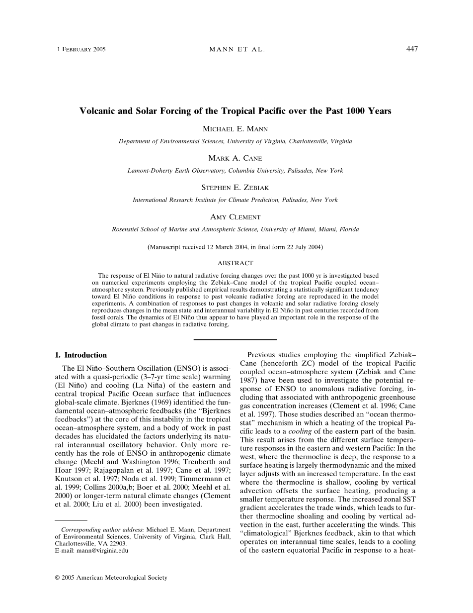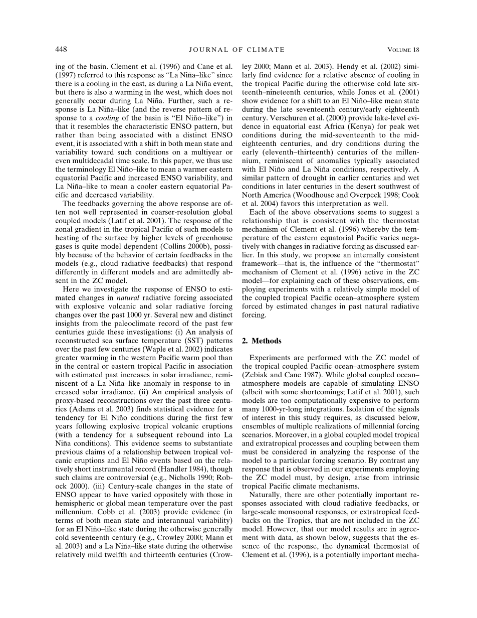 上述每一个观察结果似乎都表明了与Clement等人的恒温器机制一致的关系(1996)其中就像前面讨论东赤道太平洋的温度随辐射强迫的变化而负变化。在这项研究中,我们提出了一个内部一致的框架,即活跃在ZC模式中的Clement等人的“恒温器”机制的影响(1996),来解释每一个观测结果,采用一个相对简单受过去自然辐射强迫的估计变化影响的热带太平洋-大气耦合系统模式的试验。