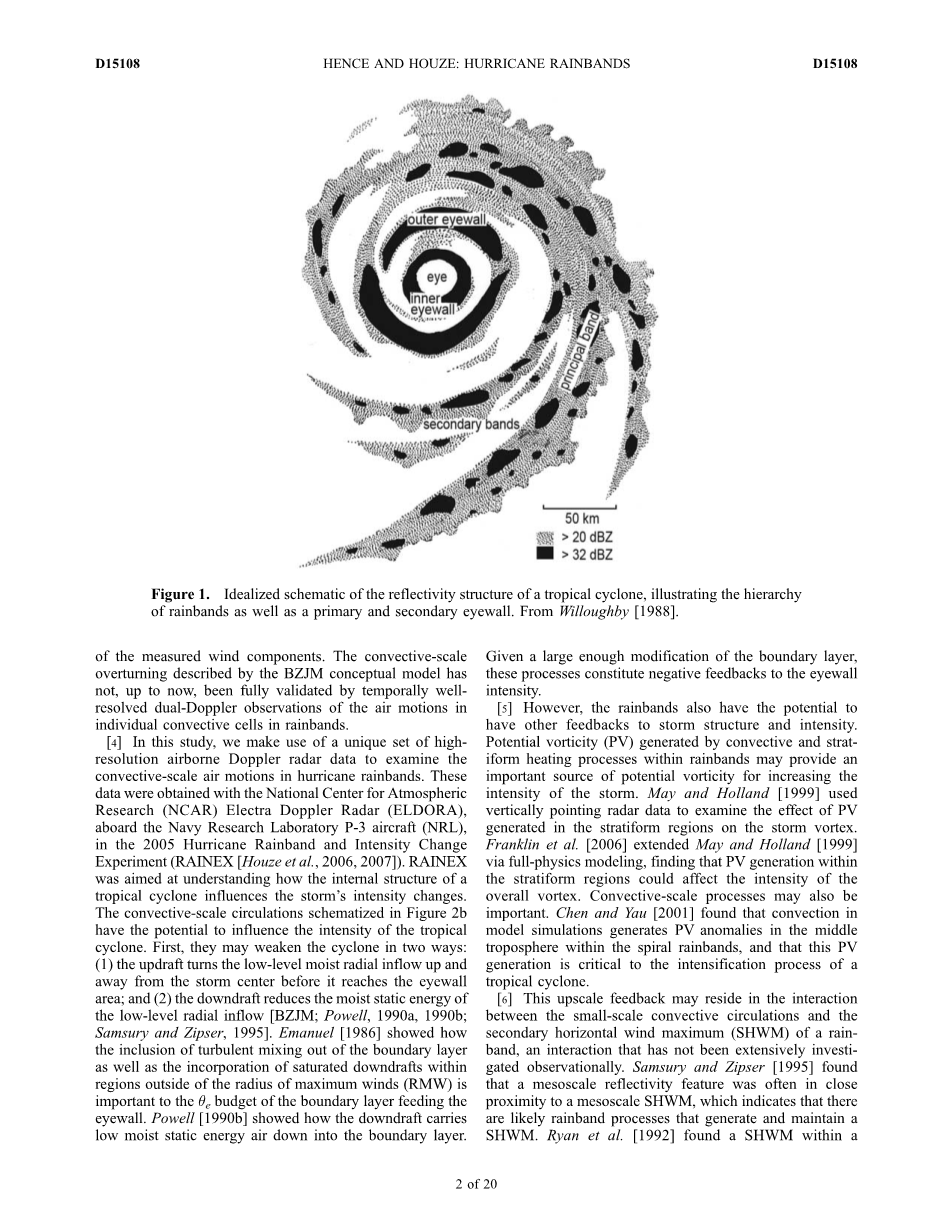 巴恩斯等指出,雨带的低层径向流入和观察表明,雨带可能提供一个“部分障碍”的潮湿流入风暴。从原位收集飞行高度数据每隔1 s和多层(150 - 6500m),他们进一步推断,雨带中的对流元素包含两个循环:径向向外倾斜上升气流和下行径向流入气流带来低theta;到空气较低层。他们和其他先前的调查人员严重依赖从地面和机载雷达获得的雷达反射率和从调查结果和飞机惯性导航系统的辅助信息。没有充分利用多个多普勒雷达观测来推断对流尺度循环。鲍威尔和巴恩斯等推导雨带小尺度循环方面使用复合材料的伪双多普勒数据,通过飞越目标在两个不同的轨道上获得两个视角,它介绍了错误由于无同时性测量风的组件。BZJM概念模型所描述的对流尺度到目前好没有被完全验证,被暂时看好的雨带中个别对流单体空气运动的多普勒观测。