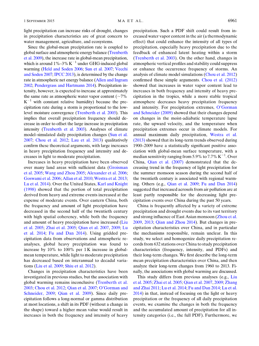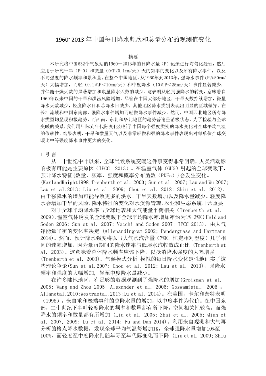 1960~2013年中国每日降水频次和总量分布的观测值变化外文翻译资料