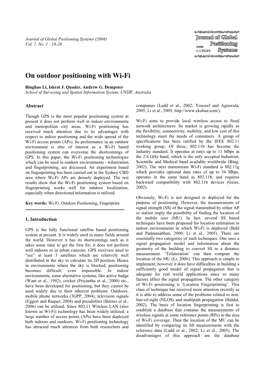 虽然GPS是现在最流行的定位系统,但是它在室内环境和大城市区域表现不完美。Wi-Fi定位现在备受关注由于其在室内定位方面的优势和Wi-Fi接入点(AP)的普及。由于Wi-Fi定位系统可以克服GPS的缺陷使其在室外环境的表现同样备感兴趣。在本文中,对Wi-Fi定位技术在室外环境中使用的三边测量和指纹定位进行了讨论。一个基于指纹定位的环境已经建立,在悉尼中央商务区,其中无线应用程序密集部署。测试结果表明,基于指纹的Wi-Fi定位系统非常适用于户外的定位,特别是当方向信息已经采集。