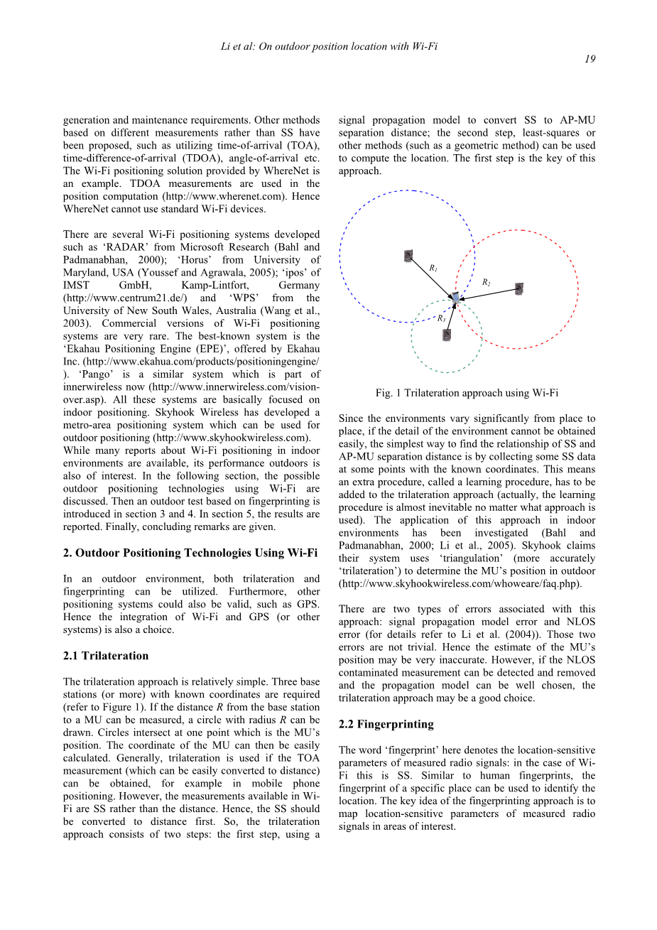 显然,Wi-Fi不是为定位这个的目的而设计或部署的。然而,测量由任一接入点或站发射的信号的信号强度(SS)意味着可能找到移动用户(MU)的位置。事实上,一些基于SS技术已经提出了用于在无线部署好的室内环境进行位置估算(Bahland Padmanabhan, 2000年; Li et al., 2005年)。基本有两类这样的技术。一种是使用信号传播模型和有关建筑物的几何学的信息将信号强度转换为距离测量。三边定位可以计算出移动用户的距离(Li, 2006年)。这种方法是简单可行的;然而建立一个足够好的适应真实世界的信号传播模型是困难的,因为有太多的影响信号传播的因素。另一种无线定位是“位置指纹定位”。这一类技术在最近获得了更多的关注是它能够解决与非视距传播和多径传播相关的问题(Haldat,2002年)。