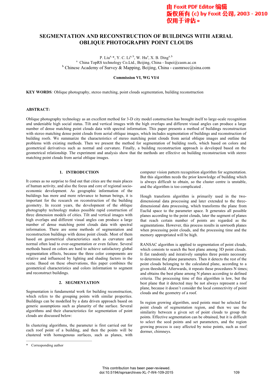 利用立体匹配点云的倾斜图像的建筑物屋顶分割和重建的解决方案的框架已被体现出。分割算法基于几何的衍生物和色度学的相似性,该算法使用表面法线,曲率和RGB颜色信息。曲率是用来判断分割的种子点,法线和RGB颜色满足条件的点将被添加到该段。因此,该方法可以消除点云波动和噪声点的影响,并能达到令人满意的分割。然而,分割效果依赖于、Tpp,rth的值。各分段形状的形成,段的关系的恢复实现了建筑物的重建。本文提出的方法不能重建的建筑物的弧形屋顶或内部环屋顶。而建筑物重建的正确性也受到了分割效果的影响。建筑改造的结果表明,该解决方案框架是有效的和可行的。