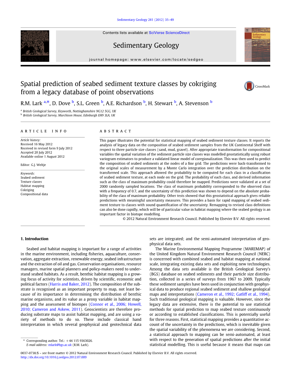 我们的目的是基于示范分类,通过地图的地理统计学对未采样的数据计算观测的四个纹理类型可能性。这使得数据使用者不仅能找出某类最可能的位置,还能算出其他类在此的可能性。本文中我们使用海底沉积物的BGS数据集生成一些密集的网络中不可直接监测的沉积物的点的地理统计预测。我们使用合适的数据转换方法来处理他们的组成形式,并使用结果来计算每一个龙(2006)提出的四个纹理类的发生概率。