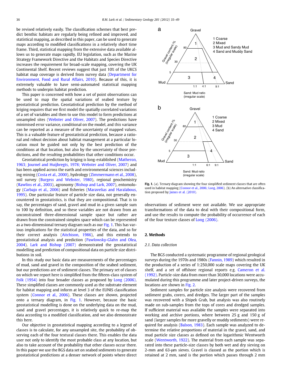 在这项研究中我们的基本数据是泥土,砂石在海底沉积物的成分的百分比测量,但我们的预测是泥沙类。我们所研究的主要类型是从15个福克(1954)系统简化成四个由龙提出(2006)的更广泛的类。这些简化的类通常被作为栖息地图的基底元素,并提交在第三级的欧洲自然信息系统的分类系统中(康纳等人,2006)。这些类被示出,投影到三元图,如图1。然而,因为基本地统计建模基于泥,沙子和碎石的百分比的基础数据,它能根据模型分类相对快速地重绘数据,并且我们也证明这一点在这里。