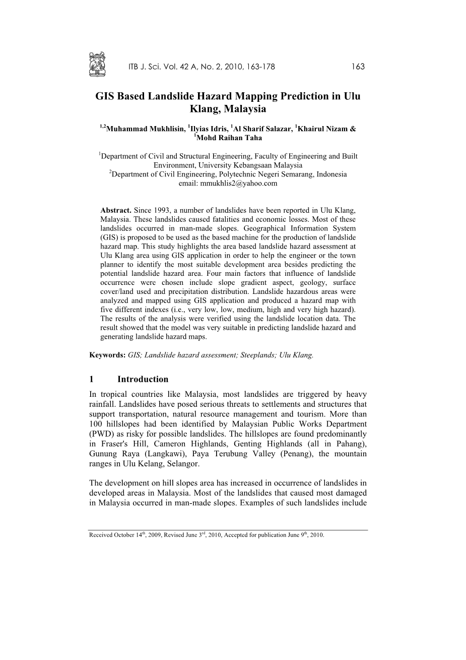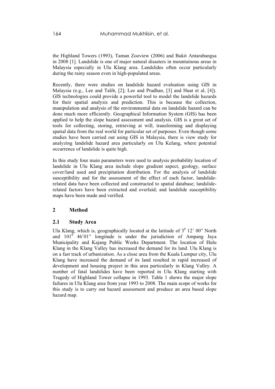 近日,有学者研究利用地理信息系统对马来西亚进行滑坡灾害评估研究(例如,Lee and Talib, Lee and Pradhan,和Huat等人)。GIS技术可以提供一个强大的工具来为滑坡灾害的空间分析和预测建立模型。这是因为在滑坡灾害数据的收集、操作和环境数据的的分析中,可以更加有效的完成。地理信息系统(GIS)已