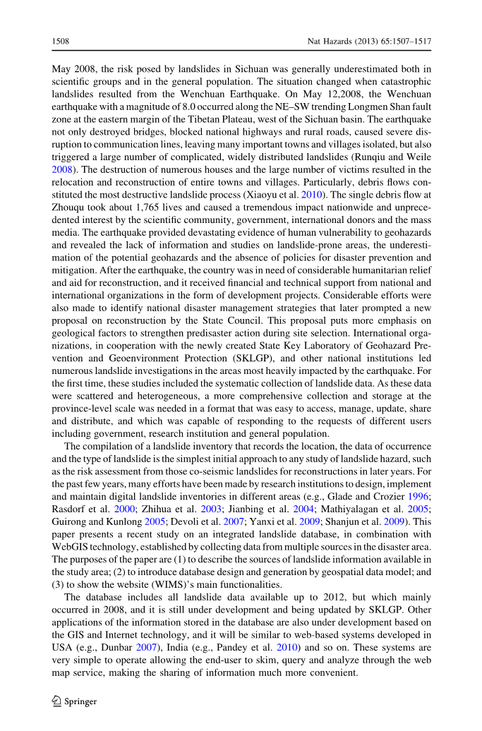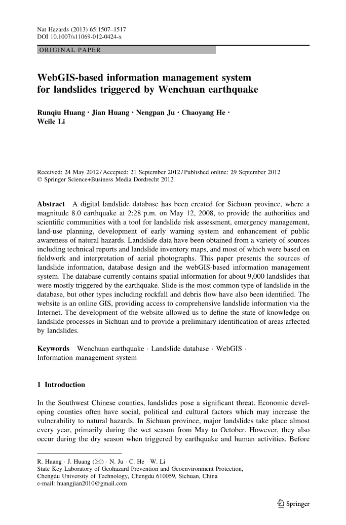 在2008年5月12日下午2:28四川发生8.0级地震时,我国基于当局和科学界提供的滑坡风险评估创建了一个数字滑坡数据库,这是一个应急管理的工具,具有土地利用规划,公共预警系统和增强发展自然灾害的意识的作用。滑坡数据来自于从各种来源获得的包括技术报告和滑坡编目地图,其中大部分是基于实地考察和航空照片的解释。本文介绍是滑坡信息的来源,数据库设计和基于WebGIS的信息化管理系统。该数据库目前包含的空间信息为约9000山泥倾泻大多由地震引发。滑动是滑坡数据库中最常见的类型,但其他类型例如崩塌,泥石流也包含在数据库中。该网站是一个在线的地理信息系统,通过互联网进入全面滑坡信息系统。该网站的发展使我们了解四川滑坡过程,并提供受影响地区的山体滑坡初步鉴定。