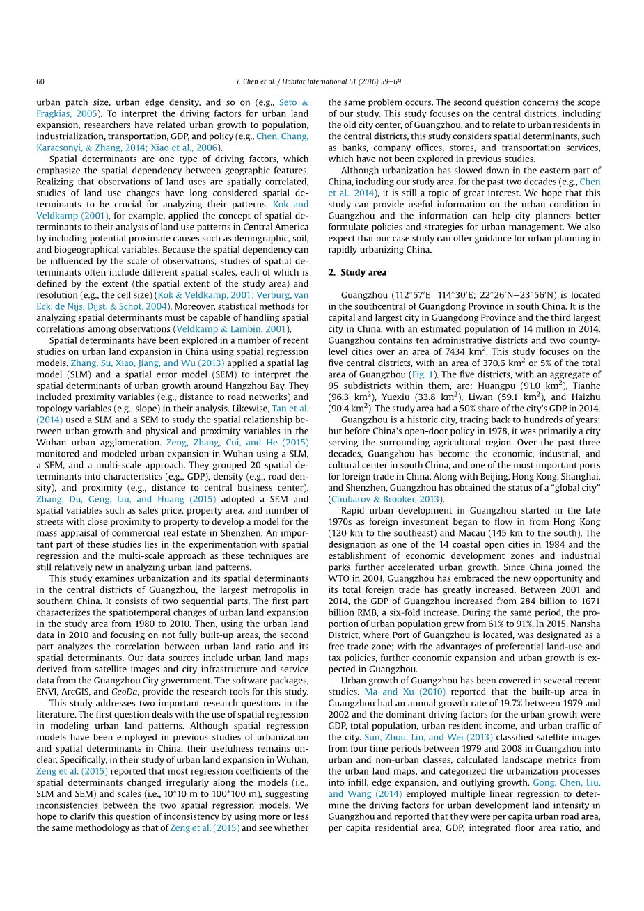 本研究讨论了文献中的两个重要研究问题。第一个问题讨论了空间回归模型在城市土地模式建模中的应用。虽然以前在关于中国城市化和空间决定因素的研究中已经采用过空间回归模型,但它们的用处尚不明确。曾志强等人[17] 在武汉城市土地扩张的研究中表明,空间决定因素的大多数回归系数随模型不呈现规则的变化(即SLM和SEM)和尺度(即10 * 10 m到100 * 100 m),这表明两个空间回归模型之间存在不一致性。本次研究希望通过使用与曾志强等人大致相同的方法来观察模型之间的不一致性的问题是否是一个普遍存在的问题。第二个问题讨论了我们研究的范围。本研究重点关注广州市中心城区,包括旧城区中心区,并涉及到中心城区居民,同以前的相关研究一样,本研究讨论了银行,公司,商店,交通运输等空间决定因素。