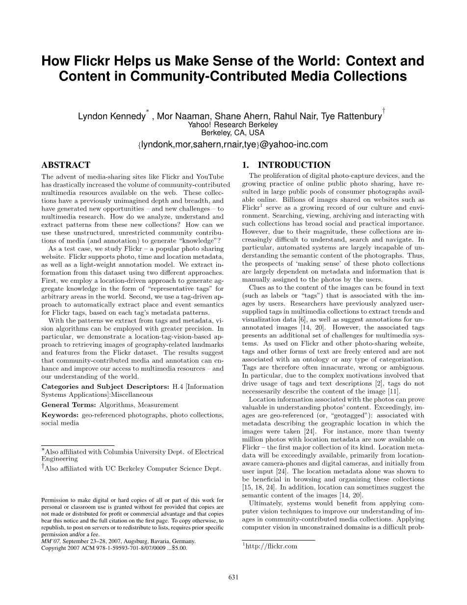 利用从标签和元数据中提取的图案,可以更精确地使用视觉算法。 特别的,我们展示了一个基于位置标签的视觉检索地理相关地标图像的方法和Flickr数据集的特征。 结果表明网络共享媒体和注释可以增强和改善我们获取多媒体资源的能力及我们对世界的了解。