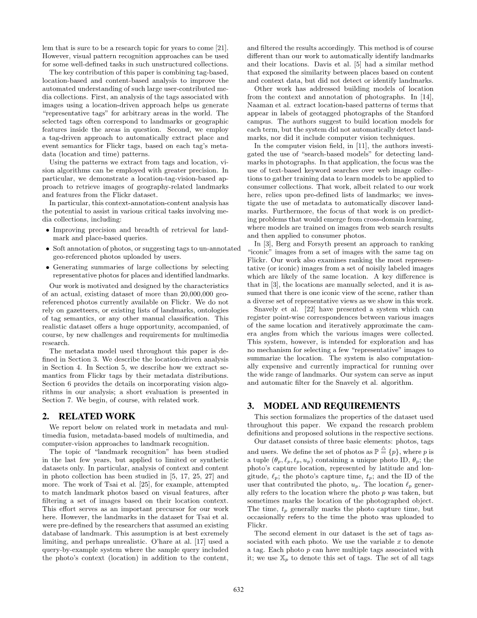 本文中使用的元数据模型在第3节中定义,我们描述的位置驱动分析在第5节中,我们将介绍如何通过元数据分发从Flickr标签中提取语义。第6节提供了将视觉算法纳入分析的细节;,简要评价出现在第7节。当然,我们从相关的工作开始。