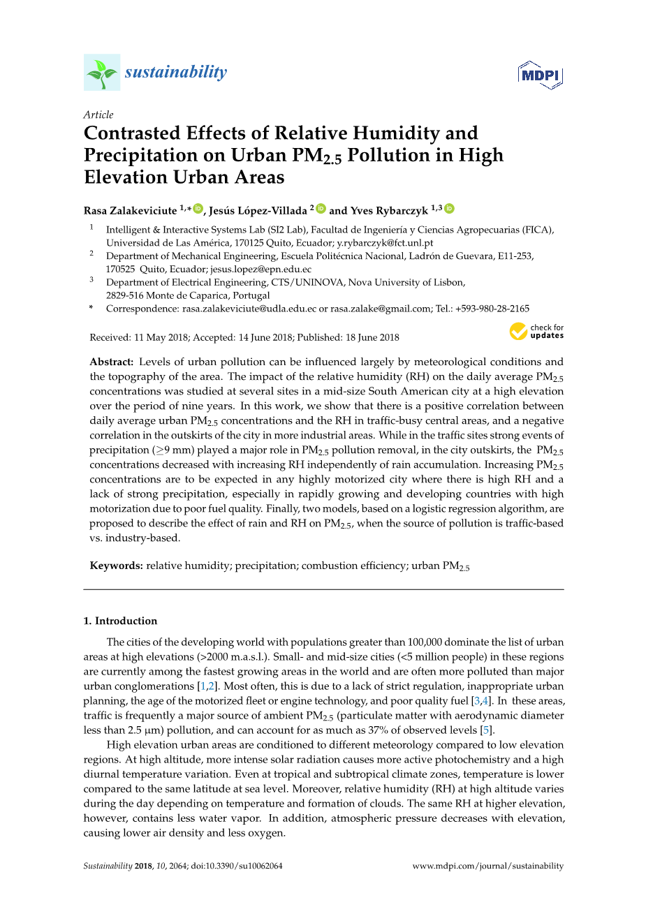 城市的污染水平主要受气象条件和该地区的地形的影响。在南美一个中等城市的高海拔地区,研究了9年来相对湿度(rh)对PM2.5日均浓度的影响。在这项研究中,我们发现城市交通繁忙中心区PM2.5日均浓度和相对湿度,与工业区郊区的日均浓度呈负相关。在交通站点,强降水(ge;9mm)对PM2.5污染的去除起主要作用,而在城市郊区,PM2.5浓度随相对湿度的增加而降低,与降雨积累无关。任何高度机动化的城市,尤其是在快速增长的发展中国家,由于燃料质量差,其相对湿度高,降水量少,PM2.5浓度预计会增加。最后,当污染源是基于交通的时候,提出了两种基于逻辑回归算法的模型来描述降雨和相对湿度对PM2.5的影响。