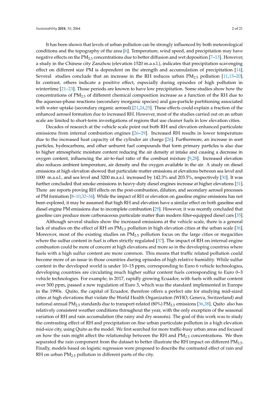 尽管有几项研究表明,在车辆规模上,排放量增加,但在高海拔城市中,一般缺乏关于相对湿度对PM2.5污染影响的研究[36]。此外,现有关于PM2.5污染的研究大多集中在大城市或大城市,在这些大城市中,燃料中的硫含量往往受到严格的管制[37]。在高海拔地区,相对湿度对内燃机燃烧的影响可能更为令人关注,而在含硫量较高的发展中国家,相对湿度对内燃机燃烧的影响更为普遍。这意味着,在相对湿度较高的情况下,与交通有关的污染可能成为这些国家的一个更大问题。虽然发达国家的硫含量低于10-15ppm,相当于欧洲6号汽车技术,但发展中国家正在流通相当于欧洲0-3号汽车技术的高含硫量燃料。例如,2017年,含硫量超过500 ppm的快速增长的厄瓜多尔通过了一项新的欧洲3号法规,这是20世纪90年代欧洲实施的标准。因此,厄瓜多尔首都基多为研究违反世界卫生组织(世卫组织)的高海拔中等城市提供了一个完美的场所。瑞士日内瓦和国家年度PM2.5标准,由于运输相关(80%)PM2.5排放[36,38]。基多全年的气候条件也相对一致,除了相对湿度和降雨积累的季节性变化(雨季和旱季)。本文以基多市为模型,研究了高海拔中等城市大气中相对湿度和降水量对细颗粒物污染的影响。我们首先搜索了更多交通繁忙的城市地区,重点研究了降雨可能如何影响相对湿度和PM2.5浓度之间的关系。然后,我们将雨水成分与数据集分离,以更好地说明相对湿度对不同PM2.5的影响。最后,提出了基于logistic回归的模型来描述降雨和相对湿度对城市不同地区PM2.5污染的对比效应。
