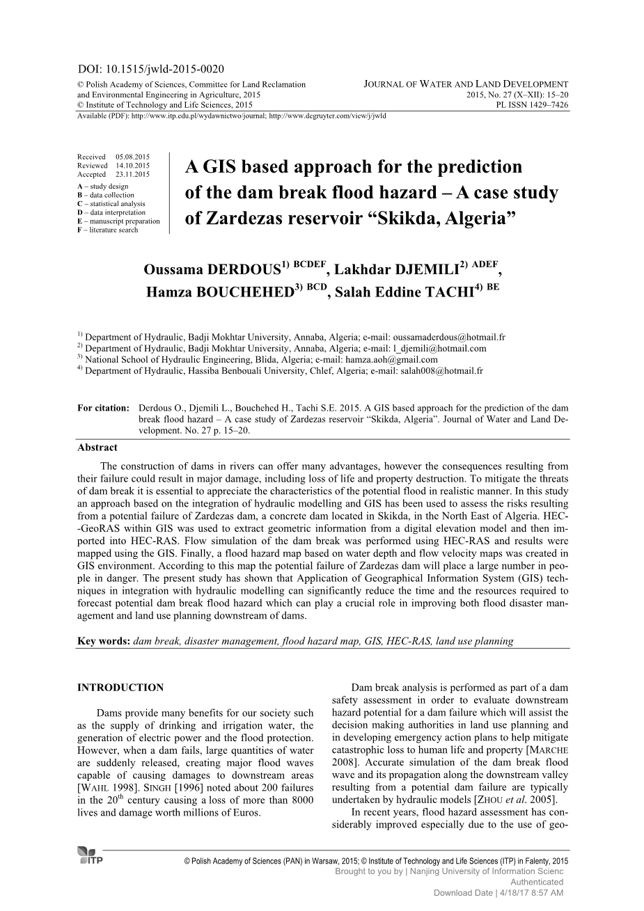 1) Department of Hydraulic, Badji Mokhtar University, Annaba, Algeria; e-mail: oussamaderdous@hotmail.fr