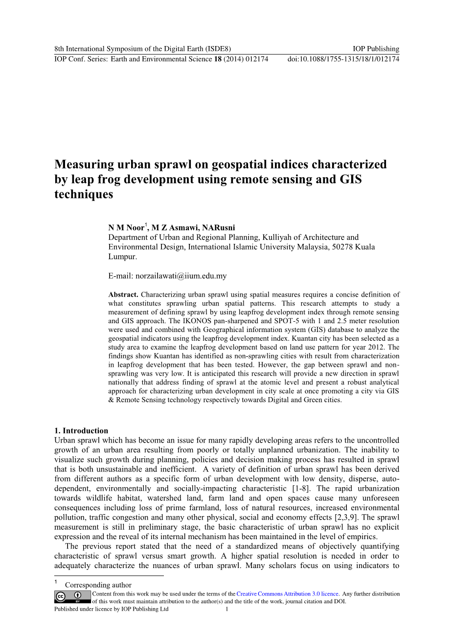 蛙跳式发展是一种分散的城市化形式,城市土地利用脱节,散步着绿地。如果是“不连续性”,则开发被认为是从开发用地到未开发用地的蛙跳[6]。这种蛙跳式发展发生在开发商建造新住宅时,与现有的城市地区保持一定距离,绕过靠近城市的空置地块。换言之,开发商选择在离城市较远的较便宜的土地上建造,而不是在离城市较近的较昂贵的土地上建造。蛙跳式发展的影响确实产生了一些额外的成本,基础设施必须延伸得更远,更长的距离会带来更复杂的交通和更长的通勤时间。蛙跳式发展在马来西亚的土地利用发展中似乎也有类似的潜力。这种情况可以在市中心外的新住宅区开发中看到,尤其是在彭亨州。因此,本研究的目的是利用遥感与地理信息系统技术,测量地理空间指标来研究城市蔓延问题,确定区分城市蔓延和非城市蔓延发展的经验指标,并且运用遥感和地理信息系统的数据来评估马来西亚城市蔓延的特点。