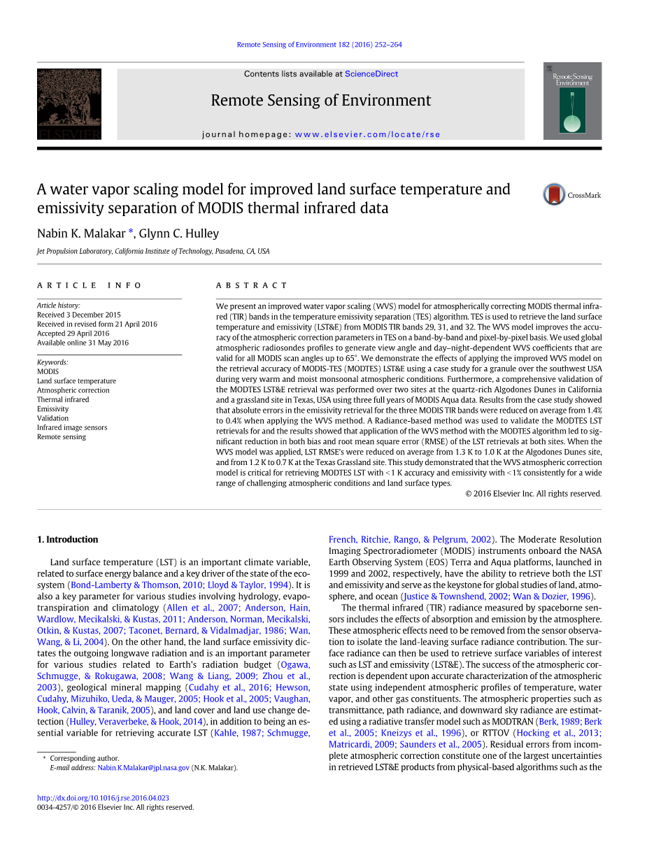 星载传感器测量的热红外辐射包括大气吸收和发射的影响。这些大气效应需要从传感器观测中去除,以隔离离地表面辐射贡献。然后可以使用表面辐射率来检索感兴趣的表面变量,例如LST和辐射率( LST amp; E )。大气校正的成功取决于使用温度、水蒸汽和其它气体成分。利用辐射传输模型如MODTRAN (Berk, 1989; Berk et al., 2005; Kneizys et al., 1996),或RTTOV (Berk, 1989; Berk et al., 2005; Kneizys et al., 1996)。来自不完全大气校正的残余误差构成了从基于物理的算法如温度发射率分离( TES )算法(Gillespie et al., 1998; Hulley, Hughes, amp; Hook, 2012),,对于从先进的星载热发射和反射辐射计( ASTER )中获取的LST,在温暖潮湿的大气条件下,可达3 K,对于MODIS,可达4.5 K (Hulley, Hughes et al., 2012)。为了提高TES算法的精度,对已建立的水蒸气定标( WVS )方法进行了改进和改进,使用扩展的多波段/水汽相关( EMC / WVD )算法(Tonooka, 2005a).逐波段提高每次观测的大气参数精度。WVS方法是水汽相关( WVD )算法的扩展(Franccedil;ois amp; Ottle, 1996),该算法已成功地结合到TES算法中,TES算法用于生成网格化的全球ASTER发射率图,例如北美ASTER陆地表面发射率数据库( NAALSED )(Hulley amp; Hook, 2009b)和ASTER全球发射率数据库v3和v4 ( ASTER GED ) (Hulley et al., 2015)。在MODIS算法中,也采用了加权平均法用于生产新的LST amp; E产品( MOD21 )的算法2016年随着6号收藏品的发行,此外还有相当的美国国家航空航天局可见红外成像辐射计套件标准算法将于2017年发布。
