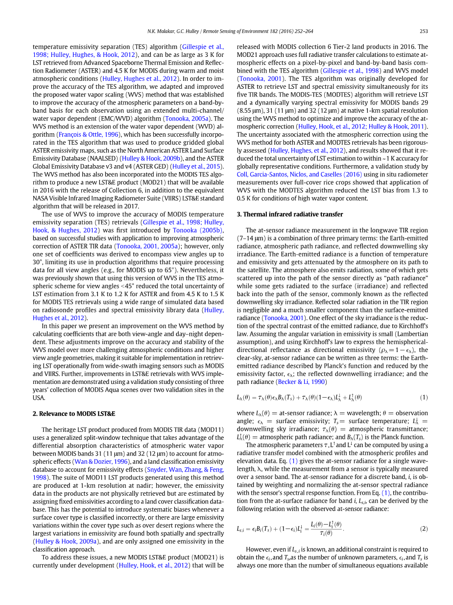 利用WVS提高MODIS温度发射率分离( TES )反演的精度(Gillespie et al., 1998; Hulley, Hook, amp; Hughes, 2012)最早是由Tonooka ( 2005b )在成功研究的基础上首次提出的,该研究应用于改进ASTER TIR数据的大气校正( Tonooka,2001,2005a );然而,仅导出了一组系数,以涵盖最大30°的视角,限制了其在需要处理所有视角(例如,最大65°的MODIS )数据的生成算法中的使用。然而,先前已经表明,在TES大气方案中使用这一版本的WVS用于视角b45,对于ASTER而言,LST估计的总不确定度从3.1 K降低到1.2 K,对于MODIS TES反演而言,使用基于无线电探空仪剖面和光谱发射率库数据的大范围模拟数据,LST估计的总不确定度从4.5 K降低到1.5 K (Hulley, Hughes et al., 2012)。