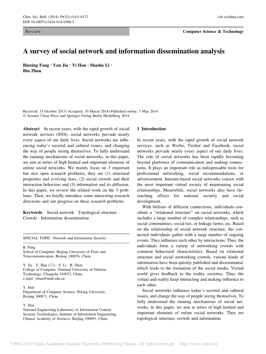 近年来,随着社交网络服务(SNS)的快速发展,社交网络几乎遍布我们日常生活的各个方面。 社交网络正在影响当今的社会和文化问题,并正在改变人们看待自己的方式。 为了充分了解社交网络的运行机制,本文针对一系列网络社交网络高度关键和重要的元素。 我们主要关注3个重要而又开放的研究问题,它们是:(1)结构性和演化规律;(2)社会人群及其交互行为;(3)信息及其传播。 在本文中,我们回顾了三个问题的相关工作。 然后,我们简要介绍一些有趣的研究方向和我们在这些研究问题上的进展。