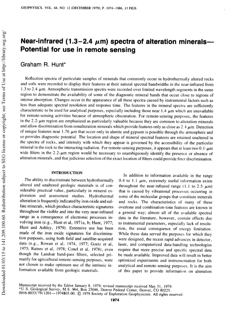 and allow discrimination from nonalteration minerals which provide features-only as-close as?.-Cpm. Detection of unique features near 1.76 pm that occur only in alunite and gypsum is possible through the atmosphere and so provides diagnostic potential. The location and shape of mineral spectral features are retained unaltered in the spectra of rocks, and intensity with which they appear is governed by the accessibility of the particular mineral in the rock to the interacting radiation. For remote-sensing purposes, it appears that at least two 0. I-pm wide filters in the 2.2-pm region would be necessary to unambiguously identify the presence or absence of alteration minerals, and that judicious selection of the exact location of filters could provide finer discrimination.