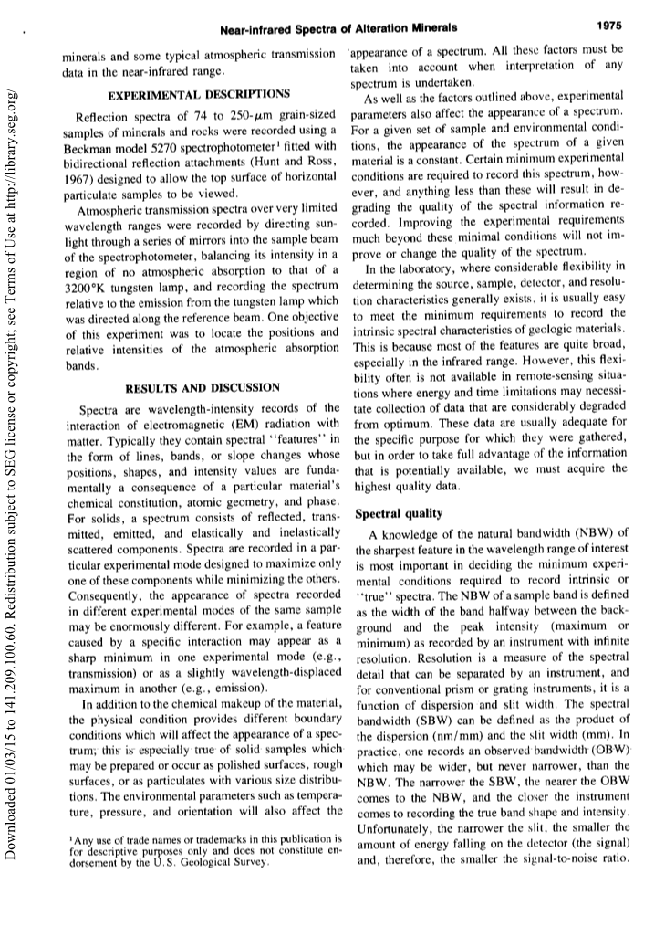to instrumental parameters, especially lack of resolution, the usual consequence of energy limitation. While these data served the purposes for which they were designed, the recent rapid advances in detector, laser, and computerized data-handling technologies require that more precise and specific spectral data be made available. Improved data will result in better optimized experiments and instrumentation for both analytical and remote-sensing purposes. It is the aim of this paper to provide information on alteration minerals and some typical atmospheric transmission data in the near-infrared range.