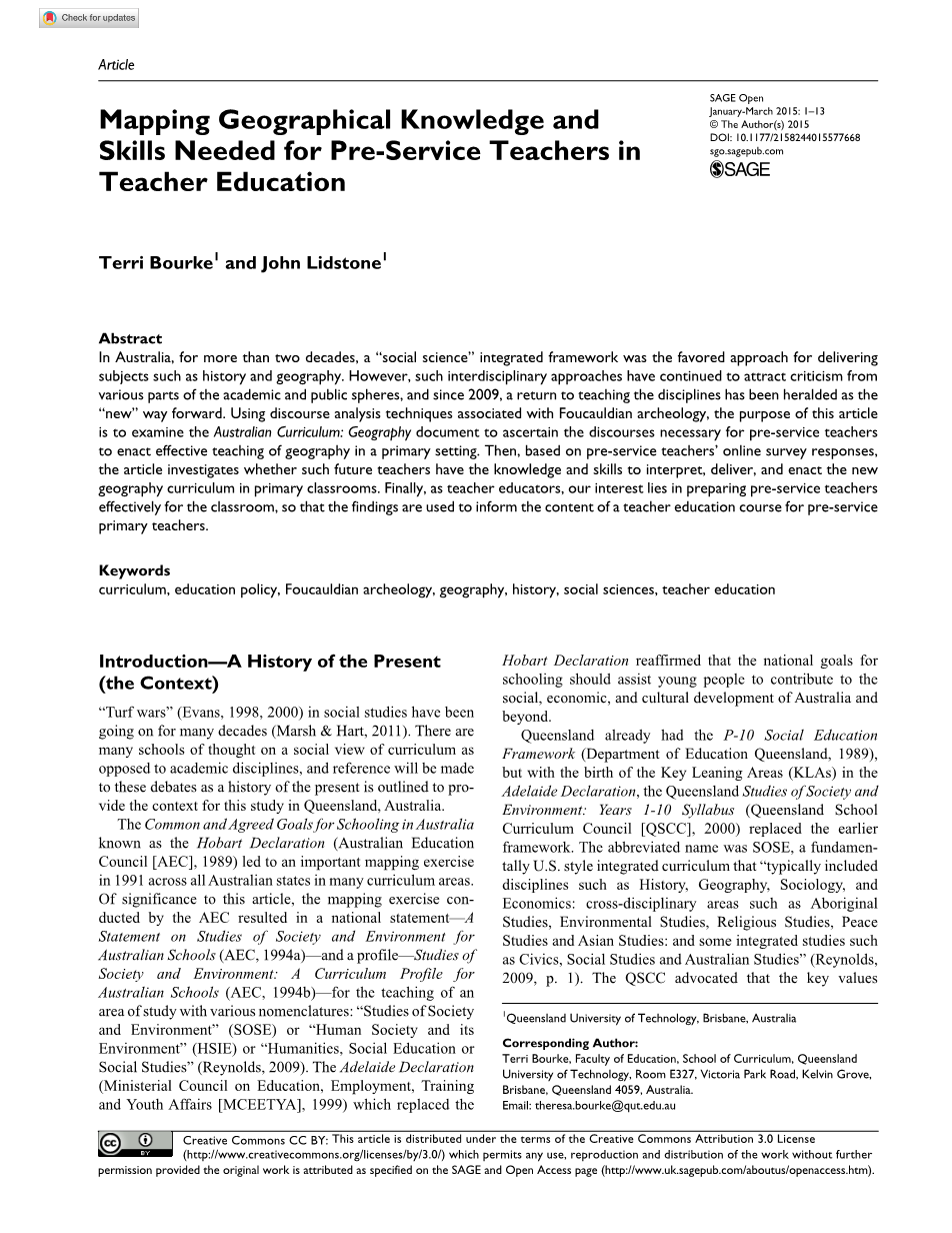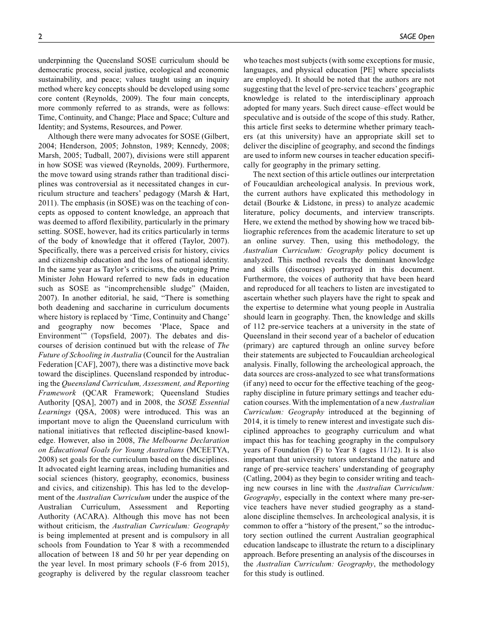 本文的下一部分概述了我们对福柯的考古学分析的解释。在以前的工作中,目前的作者已经详细地阐述了这种方法(Bourke amp; Lidstone,出版社)来分析学术文献、政策文件和采访记录。在这里,我们通过展示如何跟踪学术文献中的书目引用来扩展该方法,从而建立一个在线调查。然后,运用该方法对《澳大利亚课程:地理政策文件》进行了分析。这种方法揭示了本文描述的主要知识和技能(论述)。此外,对所有教师听到并复制的权威声音进行了调查,以确定这些运动员是否有权发言,以及他们的专业知识,以确定澳大利亚的年轻人应该在地理中学到什么。然后,对昆士兰州一所大学的112名在职教师(小学二年级)的知识和技能进行在线调查,然后对他们的陈述进行福柯的考古学分析。最后,按照考古学的方法,对数据源进行交叉分析,以了解在未来的小学设置和教师教育课程中,地理学科的有效教学需要进行哪些转换(如果有的话)。的实现一个新的澳大利亚课程:地理介绍2014年初,它是及时更新的兴趣和研究这些训练有素的地理课程和方法影响所强制年来教学地理基础(F) 8 (11/12)。同样重要的是,大学老师了解职前教师的性质和范围的理解地理(小猫,2004),他们开始考虑写作和教学新课程符合澳大利亚课程:地理,尤其是在上下文中许多职前教师从来没有学过地理作为一个独立的自律。在考古学分析中,提供“现在的历史”是很常见的,因此引言部分概述了当前澳大利亚地理教育的概况,以说明学科方法的回归。在对《澳大利亚课程:地理》中的语篇进行分析之前,先概述一下本研究的方法论。