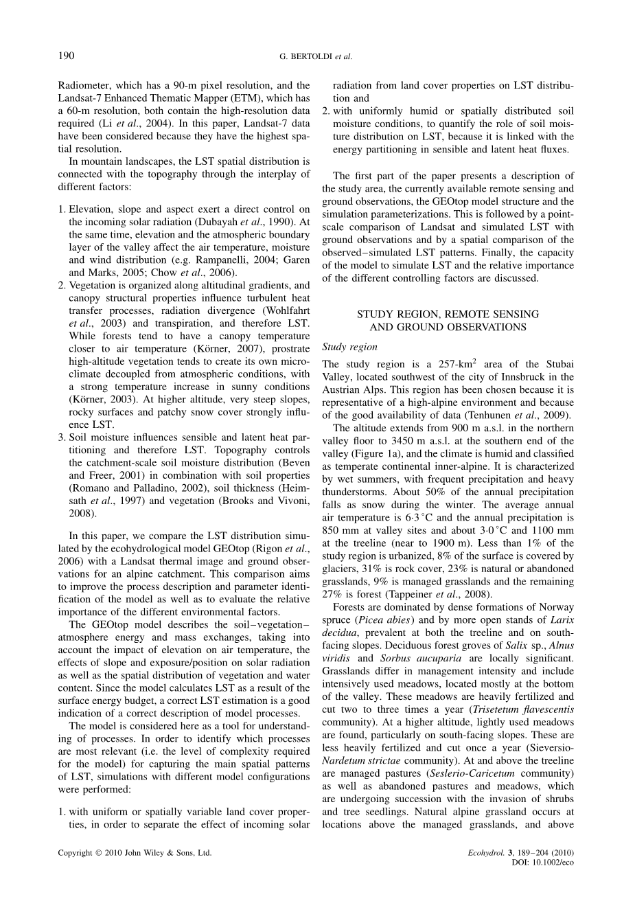 在本文中,我们将生态水文模型GEOtop模拟的LST分布(Rigon等人,2006年)与高山流域的陆地卫星热成像和地面观测结果进行比较,目的在于改进模型的过程描述和参数识别,评价不同环境因素的相对重要性。