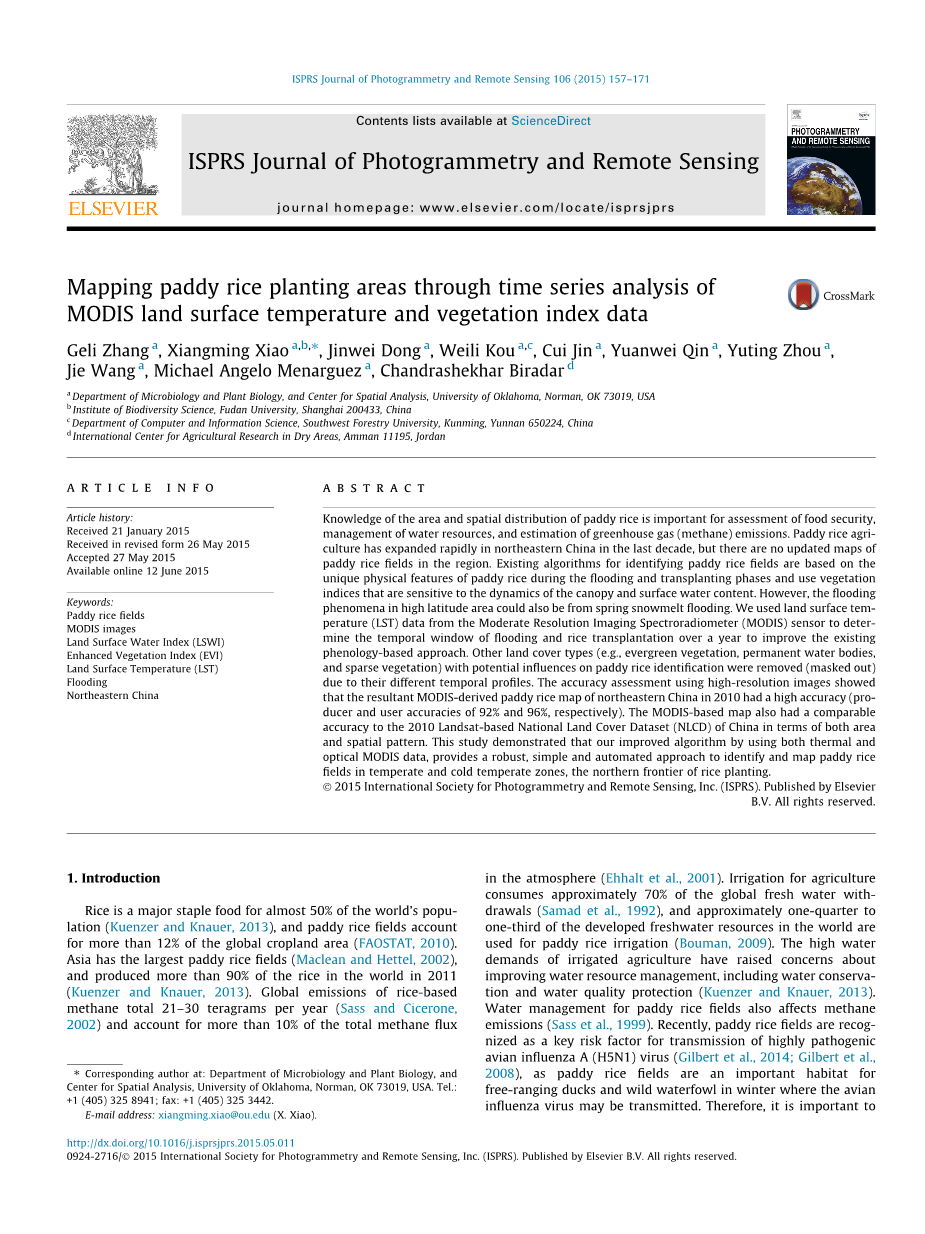 稻米是世界近50%人口的主要主食(Kuenzer和Knauer,2013),稻田占全球耕地面积的12%以上(FAOSTAT,2010)。亚洲拥有最大的稻田(Maclean和Hettel,2002年),2011年生产了世界上90%以上的稻米(Kuenzer和Knauer,2013年)。全球稻谷甲烷排放总量为每年21-30太克(Sass和Cicerone,2002年),占大气中甲烷排放总量的10%以上(Ehhalt等人,2001年)。农业灌溉消耗了全球约70%的淡水(Samad等人,1992年),世界上大约四分之一至三分之一的已开发淡水资源被用于水稻灌溉(Bouman,2009)。灌溉农业的高需水量引起了人们对改善水资源管理,包括节水和水质保护的关注(Kuenzer和Knauer,2013年)。稻田的水管理也影响甲烷排放(Sass等人,1999年)。最近,稻田被认为是传播高致病性禽流感A(H5N1)病毒的关键风险因素(Gilbert等人,2014年;Gilbert等人,2008年),因为稻田是冬季自由放养的鸭子和野生水禽的重要栖息地,在那里禽流感病毒可能会传播。因此,重要的是在区域和全球范围内监测和绘制稻田地图,以努力提高我们对粮食安全、温室气体排放、水资源管理和传染病传播的认识。